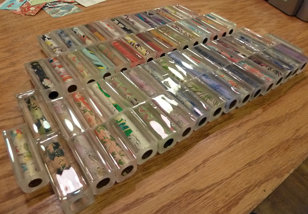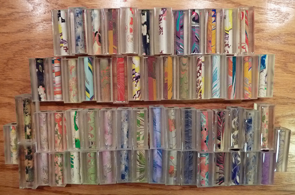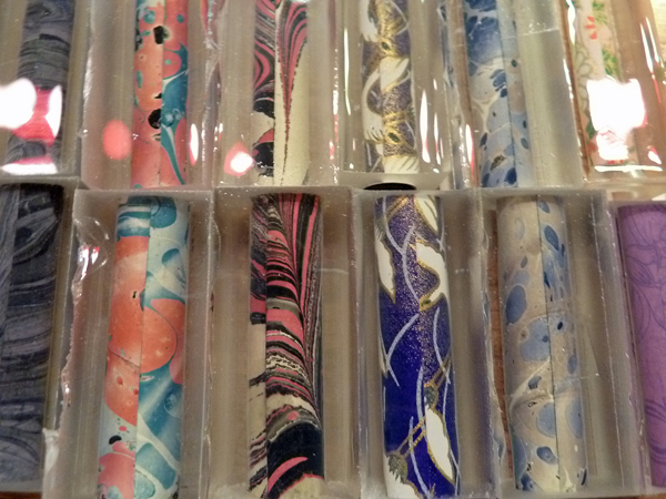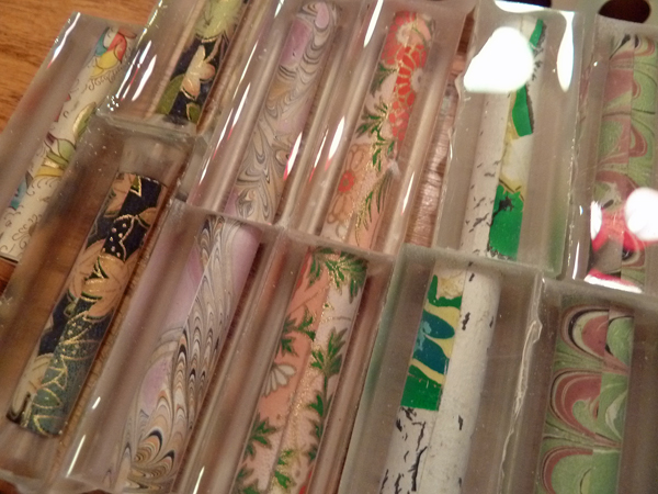 I have three (3) SFR box lots available for the cost of domestic shipping ($7.20); what you see will be split evenly in thirds (enough blanks for ~ 15 pens). Most are one-piece Sierras – with some 2-piece Baron/Sedona and Junior blanks mixed in – all wrapped in various decorative papers (e.g., Chiyogami, etc). These were sealed, cast in Liquid Diamonds @ 20 lbs. psi, and are fully cured. Most have already been squared up and are ready for the lathe. To my knowledge, they are all bubble-free.