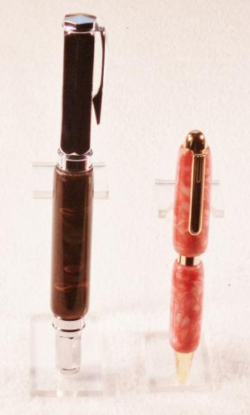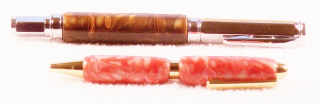 My little, almost 3, Grandaughter comes and spends Saturdays with my wife and I. She loves to color and draw with the pens I have around the house, but they are a little to large for her small hands. So I ordered some PSI Mini Designer Pens and went to work on them. They are thick pens with a large band, to large for small hands. I ditched the large band in favor of a slimline, and turned the pen down to a smaller size. I made the blanks out of Polymar Clay in her favorite pink colors, and added the Gold fittings. I put a PSI Magnetic Vertex in Chrome with rootbeer blank along side of it to give you an idea of the little pen's size. Both are finished with 8 coats of thick CA. Next one I may turn down a little more. I bought 10 of these kits to give away to kids at a show I am doing next month. I think she will be thrilled to have her very own little pink pen. What do you think? Jim S