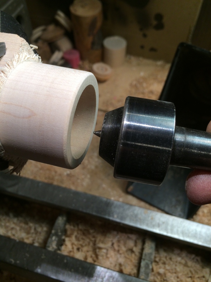I measured the live centers at the store with calipers, came home and got to work. I drilled the block with two forstner bits and then turned the larger inner diameter to a nice snug fit on the live centers. I turned six of these in case I had that many students.