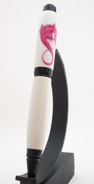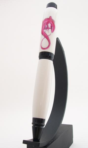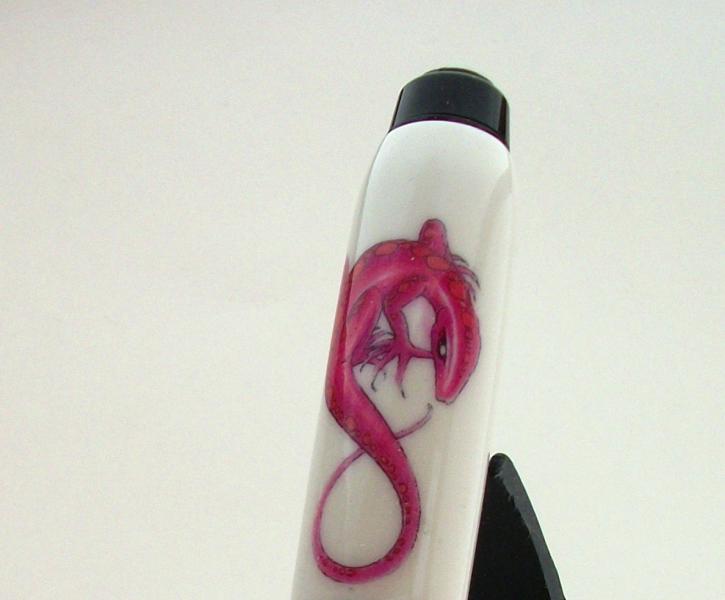 I was showing my tattoo pens around the other day and I was asked if had any lizards and if so could I do one. So I searched through all my Tattoos and came up with this one, since it is for a lady I choose pink. It is on white PVC Pipe mounted on a Black Chrome Cigar. It has a CA finish that is MM through step 5 then plastic polished.