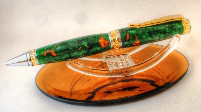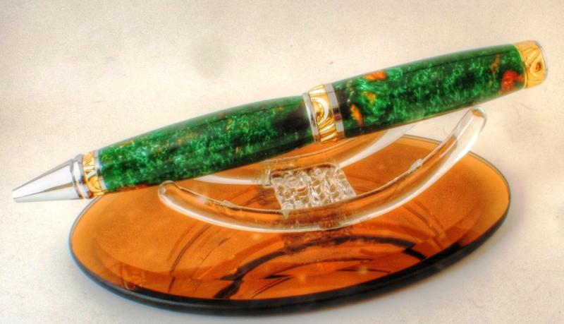 It's been a little while since I posted any thing, Life got in the way and I have not been able to get in to the shop. But I had to get this one done, it has been promised for 6 mos. This is for my sister in-law it is a green and gold blank on a ultra cigar, I really like the way the cigar looks when the CAP bushing is used on the upper part of the lower tube. It seems to flow better this way, the blank was wet sanded but had a ton of pin holes so I used thin CA to seal them and two coats of thick to fill in and smooth every thing out. It was then wet sanded to 6k then plastix polished.