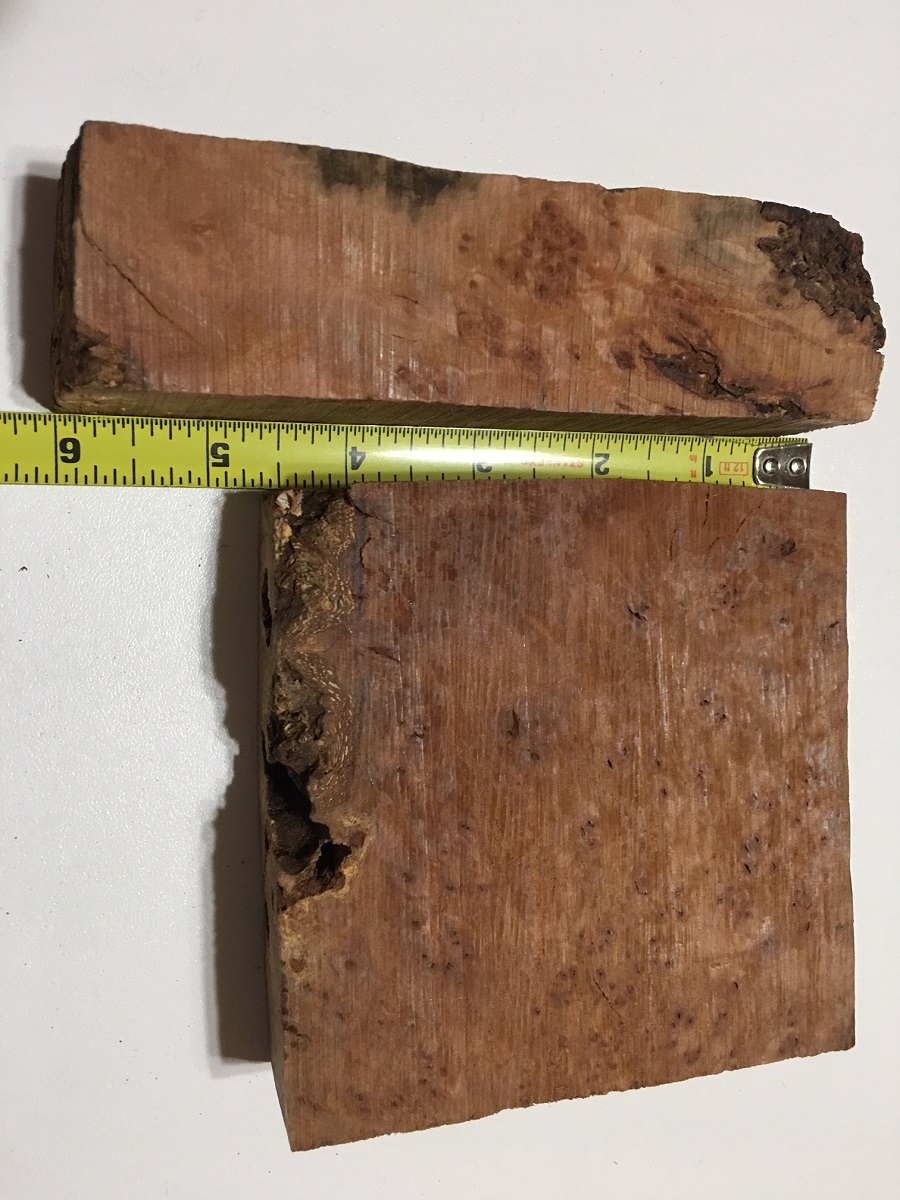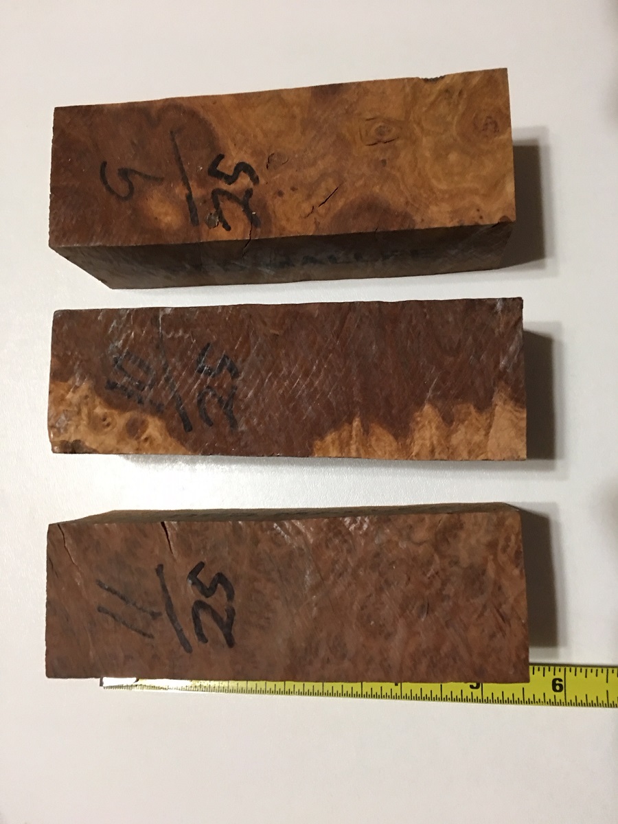 Jim, I'm not at my house until Sunday PM, but I do know I have at least one "block" about 3" x 3" x 2" of a Tasmanian Burl. I don't believe it is Myrtle, possible Tasmanian Oak Burl, or a variety of Eucalyptus. It does have cracks, so I suspect it would make nice blanks if cast in a colored PR/Alumilite. These would be shorter blanks, but at 3" should do fine for 1 or 2 blank kits.