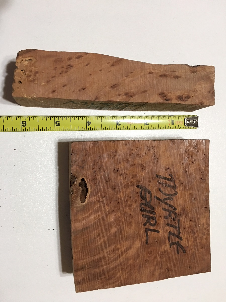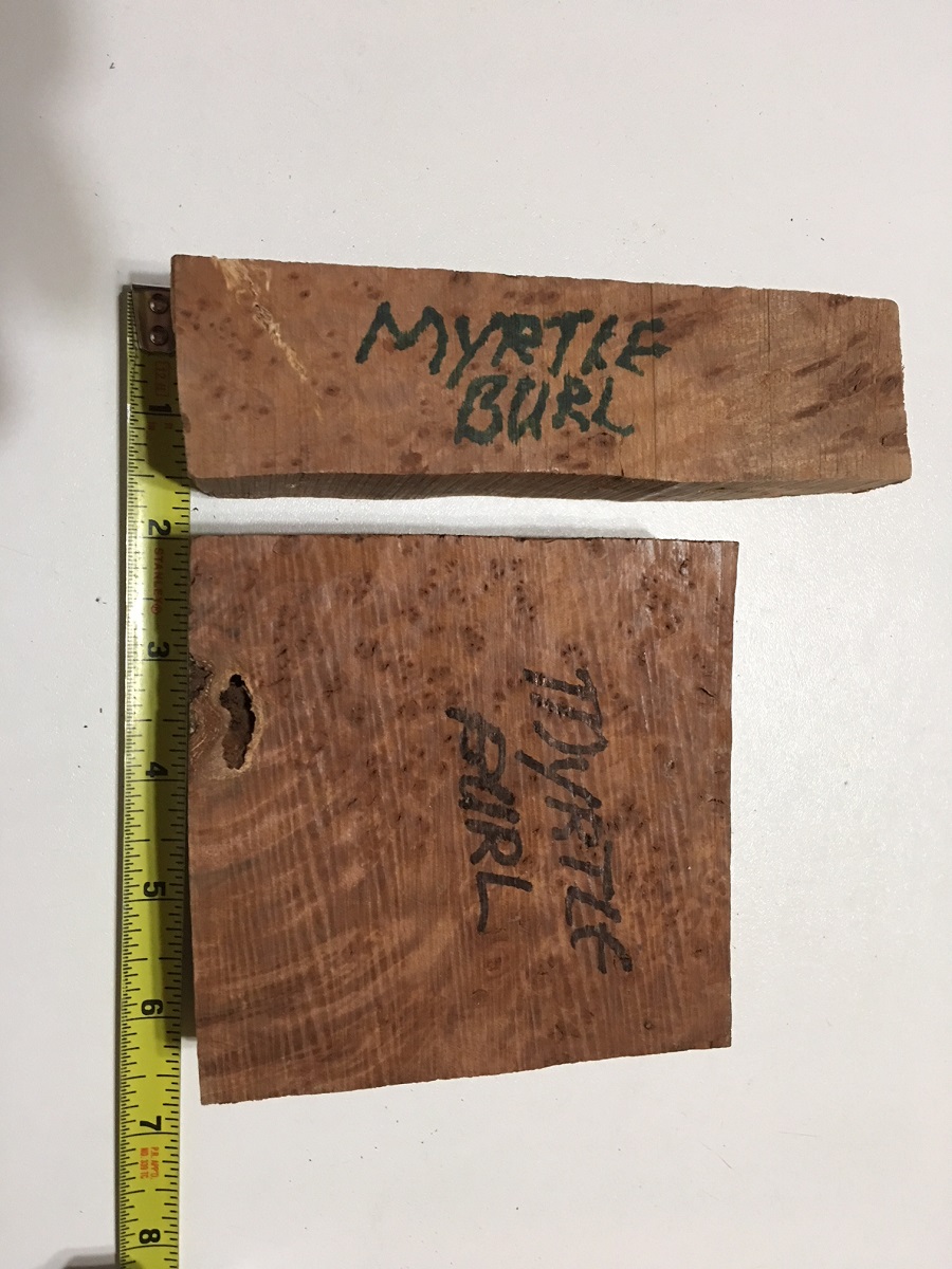 I took a quick look at my "Tasmanian Burl Box" this morning, and saw one piece of Myrtle near the top. Quick measure was 1" x 1.5" x 5.25". Very rough cut and not showing well from the outside--but it came from Richard Kleinhenz before he passed away, so i'd not hesitate to guess it to reveal good "innards". May be another piece or 2 in that box--can check tonight when i get home.
