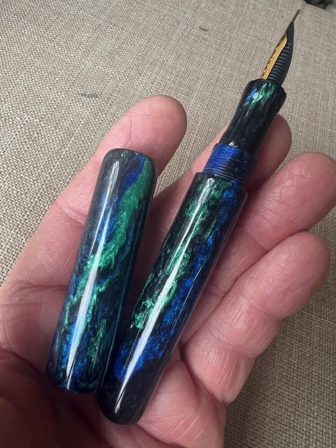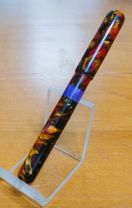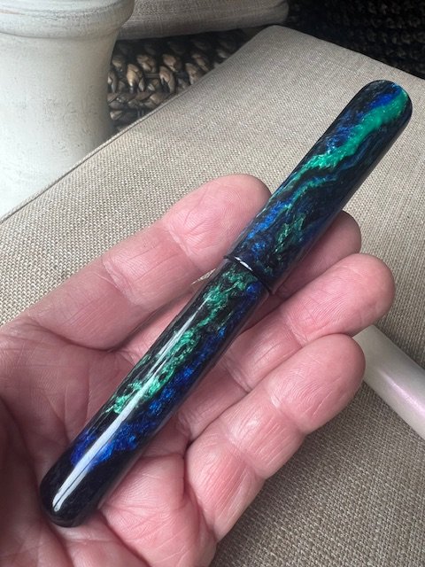 Finally a complete pen all from the same material. Since my last posting I have been trying to make a complete pen using Poly Resin. The upshot after using 20 blanks is that I have made several decent desk pens. I hesitate to say that anything is impossible, especially here, but Poly Resin is not user friendly for making bespoke pens for several reasons, which I am sure are well known here! It does polish very nicely. So, I switched to Acrylic, and attached is the completed pen. The 2 sizes that I used are M7 and M10 to create a fairly slim pen. I am not completely happy with the alignment of the cap and body, which is no doubt to some extent due to not using a tailstock die holder. Will need to negotiate with the "home boss" :). I am going to try some Alumilite next, which I believe is quite user friendly for this purpose.