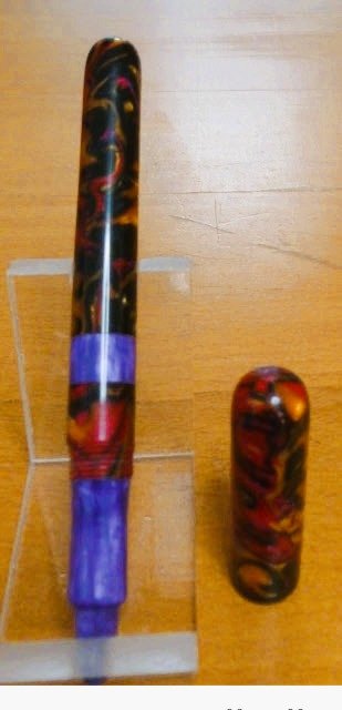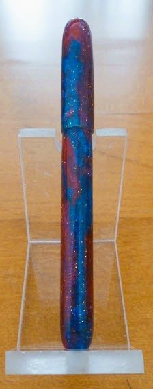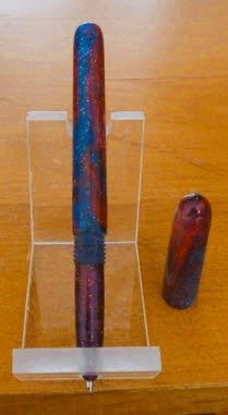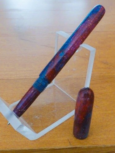 First kitless Alumilite turning using a home made blank (see attached). It uses a Cross style refill. I noticed that many kitless makers use their own blanks. They are typically round and 8.5 to 9" long. Otherwise you need 2 regular sized blanks. Âľ" sched 40 PVC plastic pipe makes a good mold. I made a couple of plain color ones by way of an experiment, ie. can I get the blank out after "cooking" in the pressure pot. Although the urethane mold release basically did its job, a spot of BF&I (brute force and ignorance) was required to get them out. Flush with my success, I made a more elaborate blank mixing 2 different colors and some "sparkles". When you make square blanks in a mold, mixing is fairly simple, but not so simple with a tube. Basically, I just guessed, but I would like to be a little more "scientific" in future if possible. I watched some utube videos but none so far have given me a warm and fuzzy feeling that some science was employed. If anyone has some "magic", I would be grateful for the technique. Of course, I could make 9" long square mold and use that, but starting from round is a great time saver.