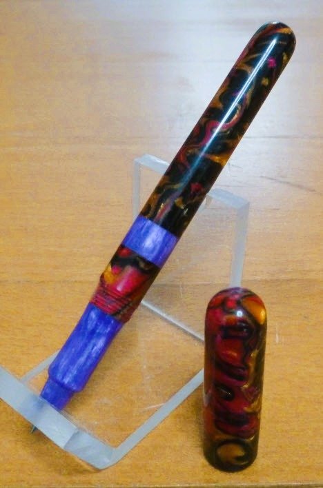 Pen with a "journey". As part of taking the next step I wanted to make a better shaped section and to use contrasting colors. The purple material is from an Alumilite blank that I made. The rest is Pearlux Alumilite blanks made by William Wood-Write. Everything was going well until I lost some threads while parting off a piece. It was my own fault for not being careful enough. Now I was stuck because I hadn't enough material to carry on as I had originally intended. So I had to improvise by joining 2 Pearlux pieces together using a piece of the purple material, which added a lot of work and time. Not sure if like the result, but I did complete the pen. I really like the Pearlux blanks, and hopefully the next one won't be so troublesome!