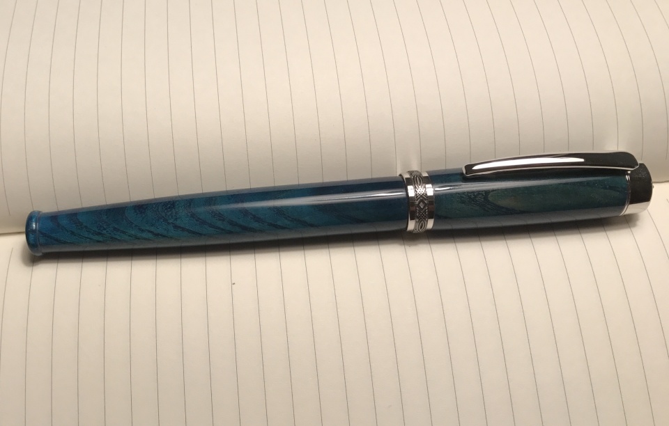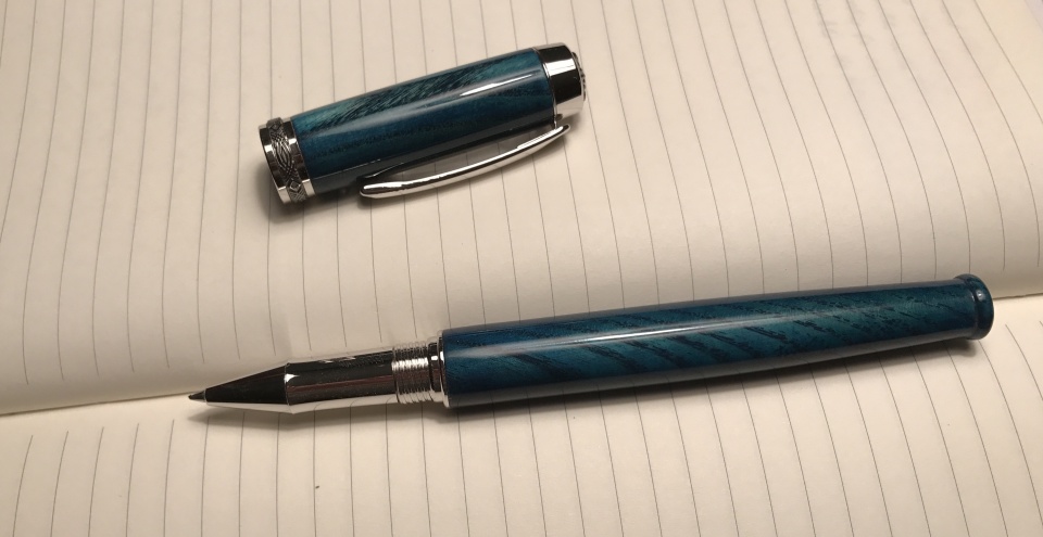 Here is a commissioned pen - the customer wanted a piece of a bat, shaped like a bat and stained blue.