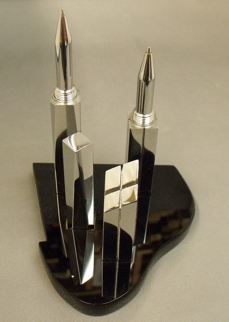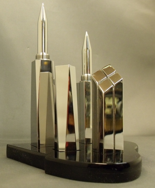 The caps of the pens fit into the footprints and sort of look like the city with all it's famous skyscrapers.