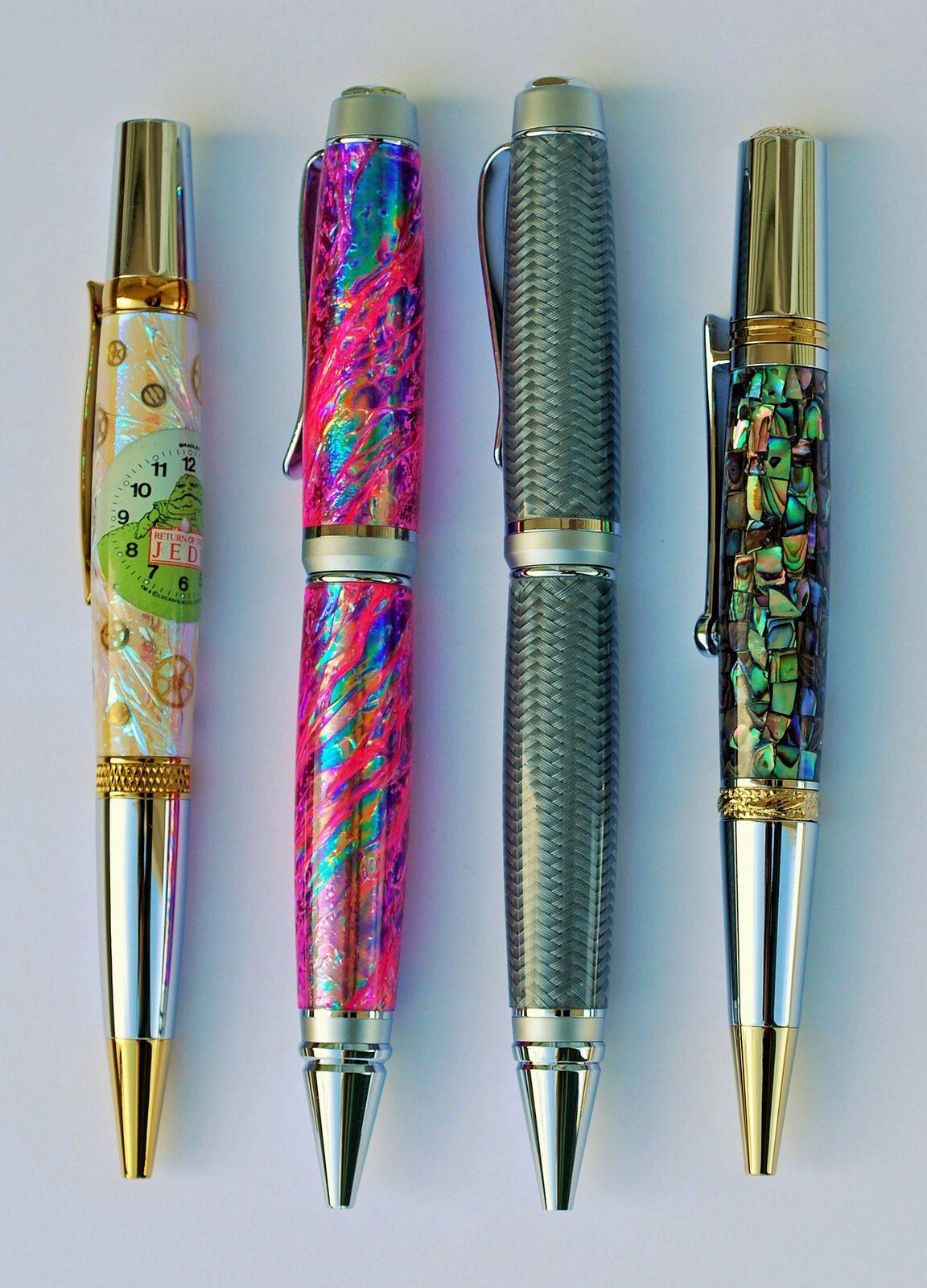 I've been pretty busy lately and haven't spent much time at the lathe. Preparing for this years Virtual MPG on April 24-25, 2021, gave me the time I needed. These are a few blanks I clear cast during my video demonstration on Clear and Vertical Casting. They are .... Star Wars watch over Snow Opal on a Chrome/Gold Ti Knurl Pen, Poison Opal on a two tone chrome Cigar pen, the water line from my old sink sprayer on another two tone chrome Cigar, and Abalone pieces on a Majestic Squire. The last Abalone blank is constructed during the video from start to finish over the four day process (with a little editing to save you from falling asleep).