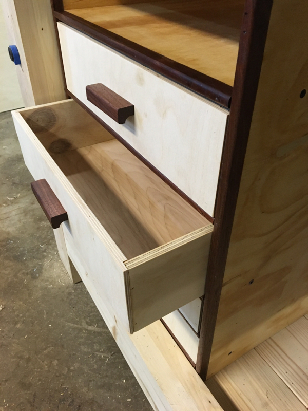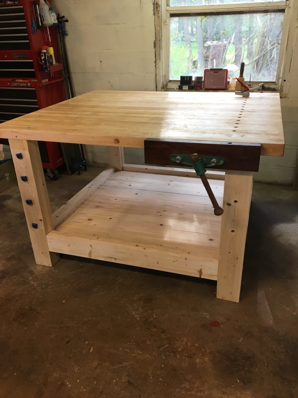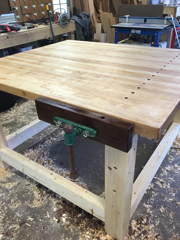 I've had a bench from a middle school shop for a couple years but it was way too low (sat on a metal cabinet) and didn't have the work holding capability that I needed. I smoothed up the top, built a whole new base, and put on a new vise (walnut vise jaw and turned walnut handle. Drilled a line of dog holes as we'll. Then added a lower shelf and some drawers.