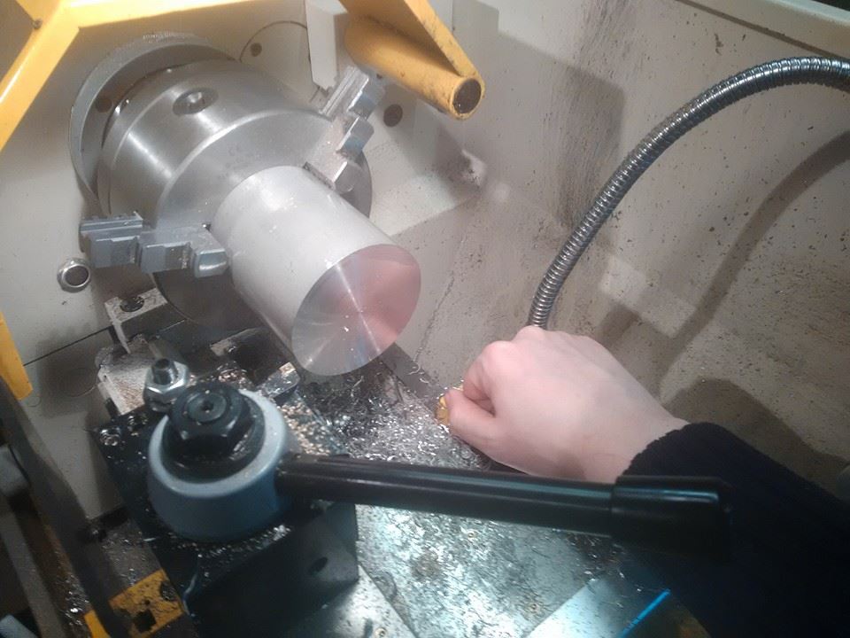 I started off with a rather large lump of aluminium to machine the base from. Detailing grooves were cut into the piece with a parting tool, and it was hollowed out to accomodate the circuit board to control the maglev