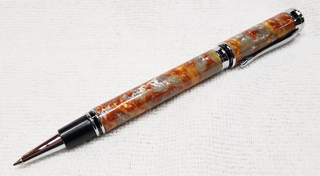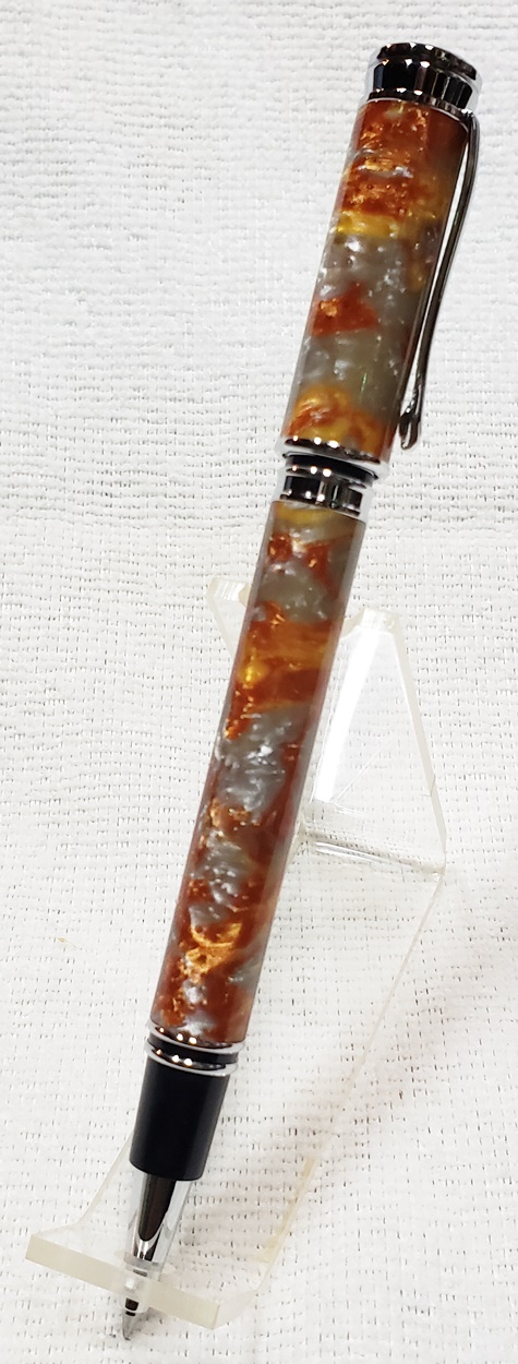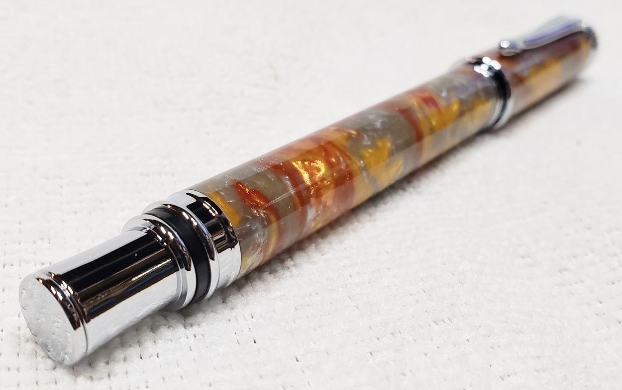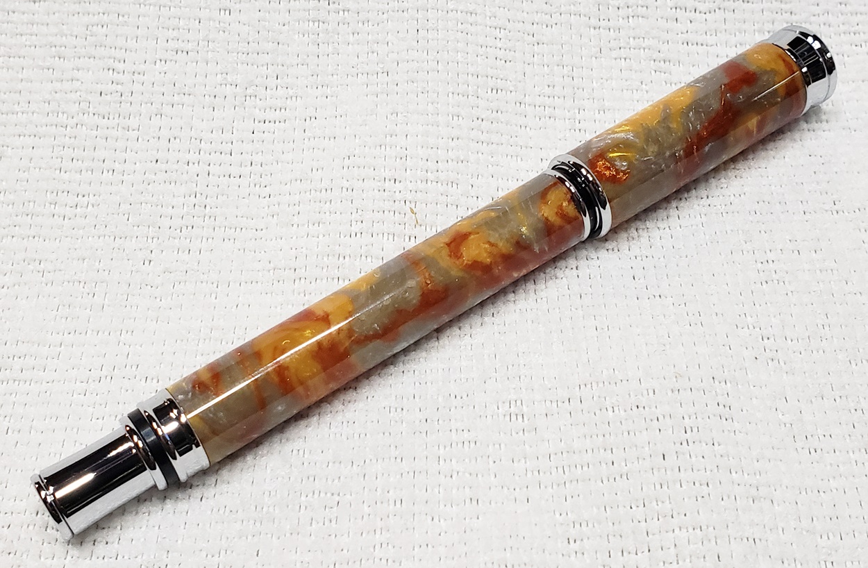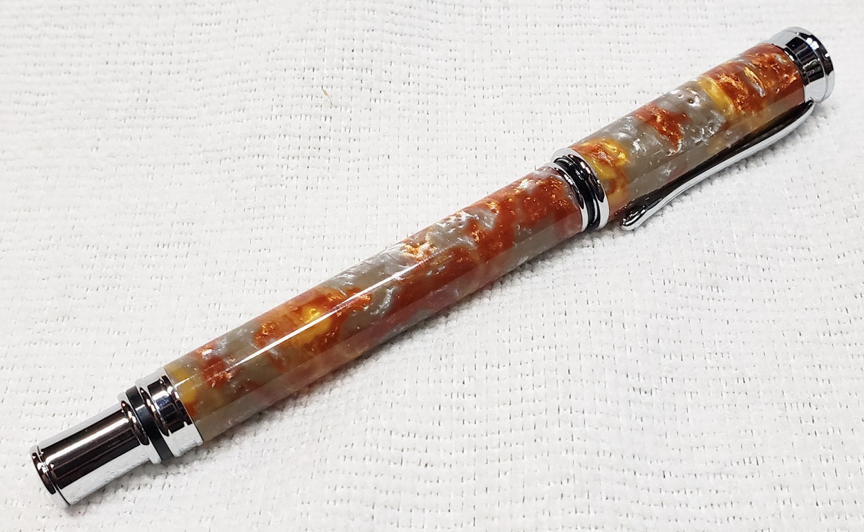 This is a magnetic Executive pen in chrome, from PSI. The cap is held onto the front or back with a powerful magnet in the center band. The blank is an inlace acrylester called Molten Metal, also from PSI. I love magnetic pens. And I love this blank, it has a lot of visual interest.