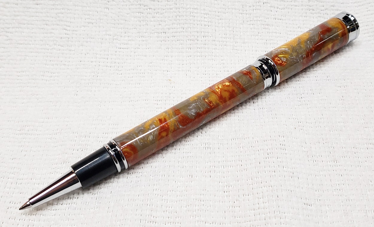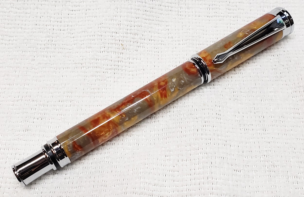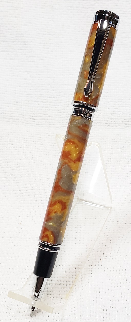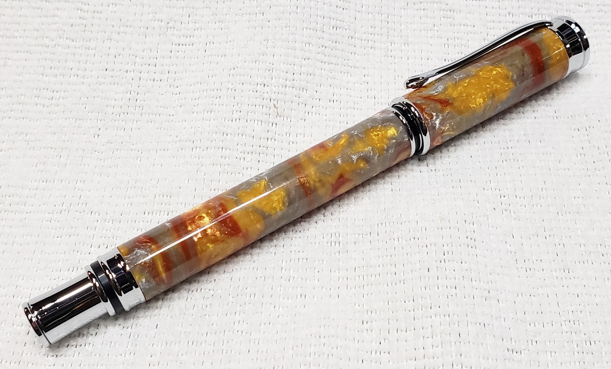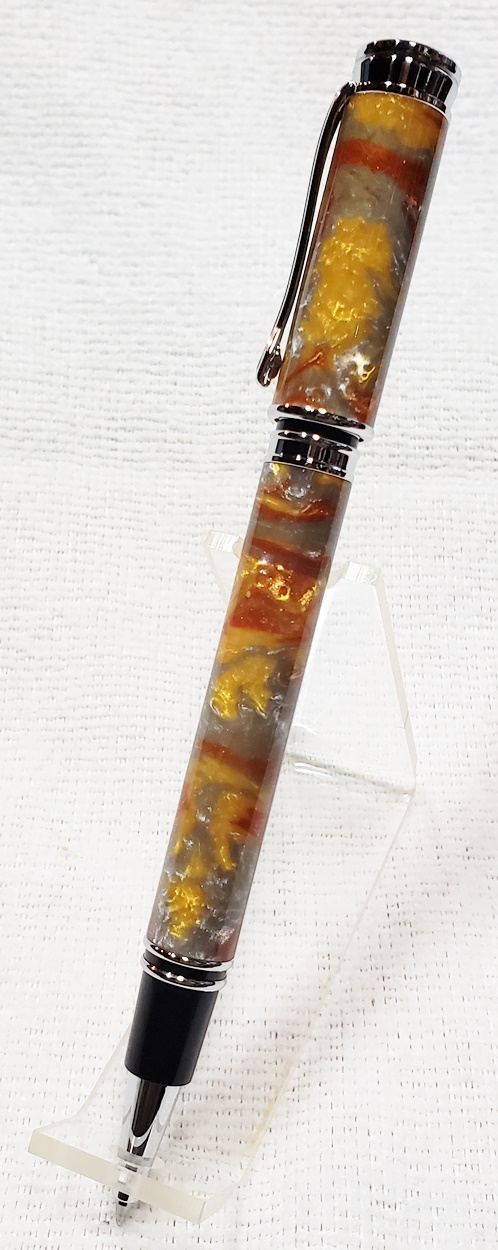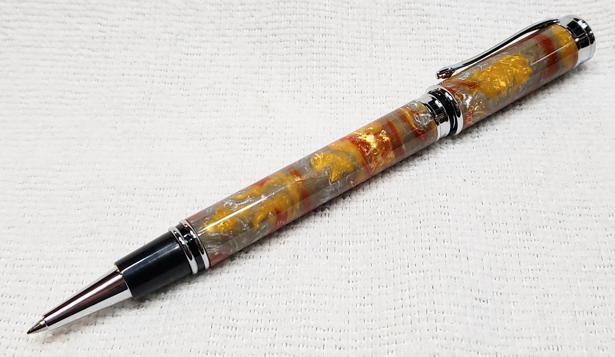 This is a magnetic Executive pen in chrome, from PSI. The cap is held onto the front or back with a powerful magnet in the center band. The blank is an inlace acrylester called Molten Metal, also from PSI. I love magnetic pens. And I love this blank, it has a lot of visual interest.