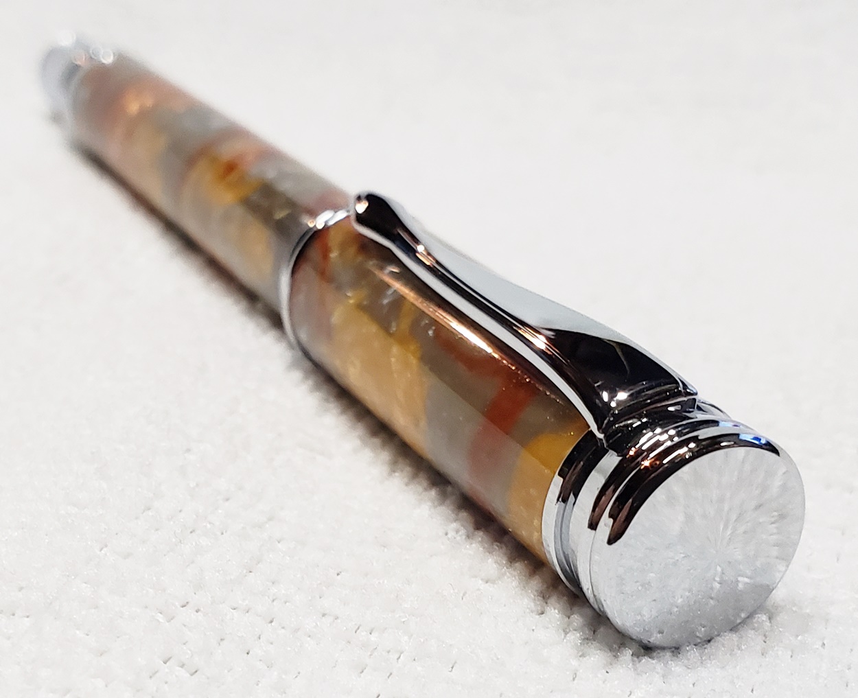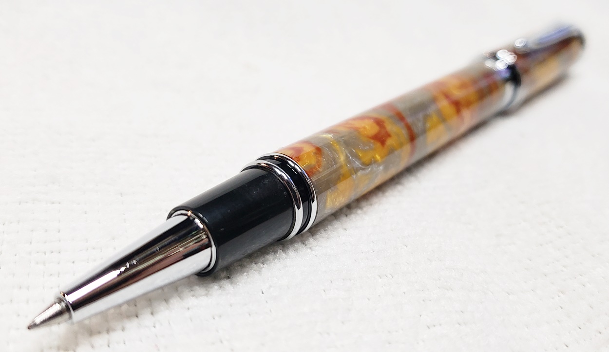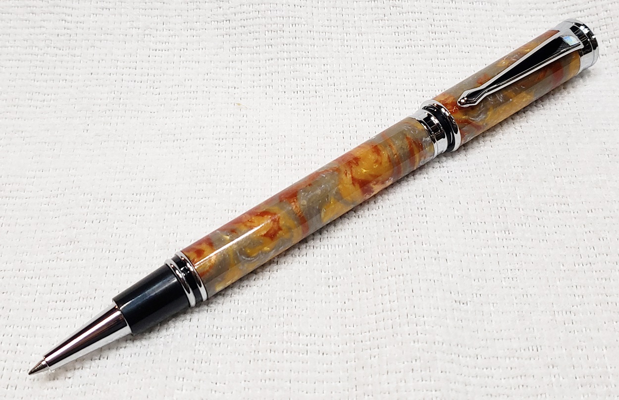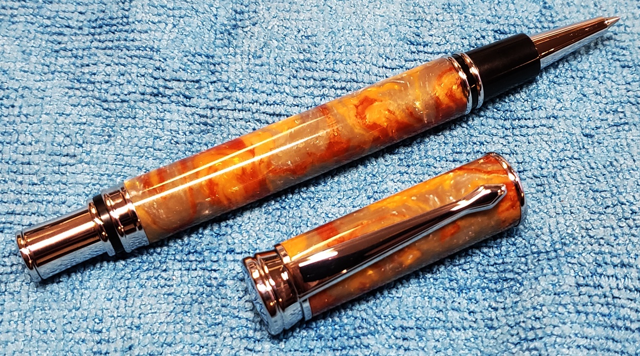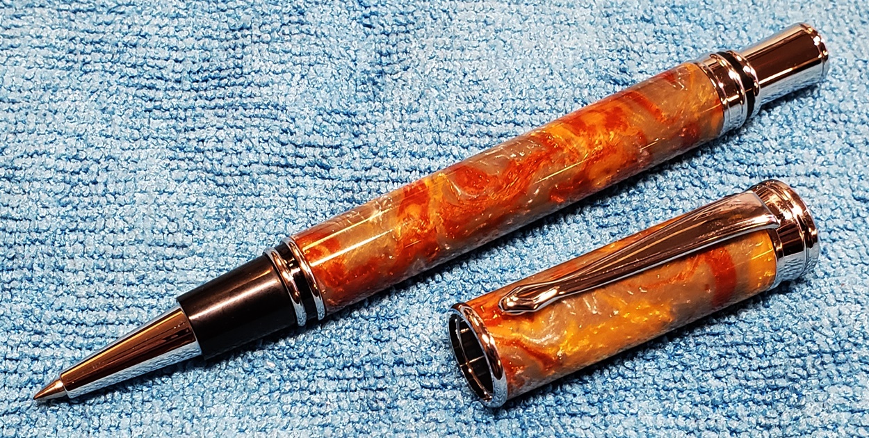 This is a magnetic Executive pen in chrome, from PSI. The cap is held onto the front or back with a powerful magnet in the center band. The blank is an inlace acrylester called Molten Metal, also from PSI. I love magnetic pens. And I love this blank, it has a lot of visual interest.