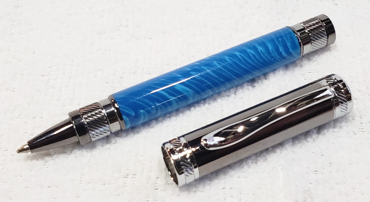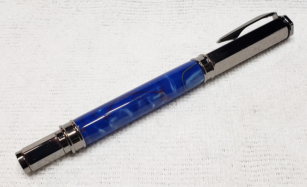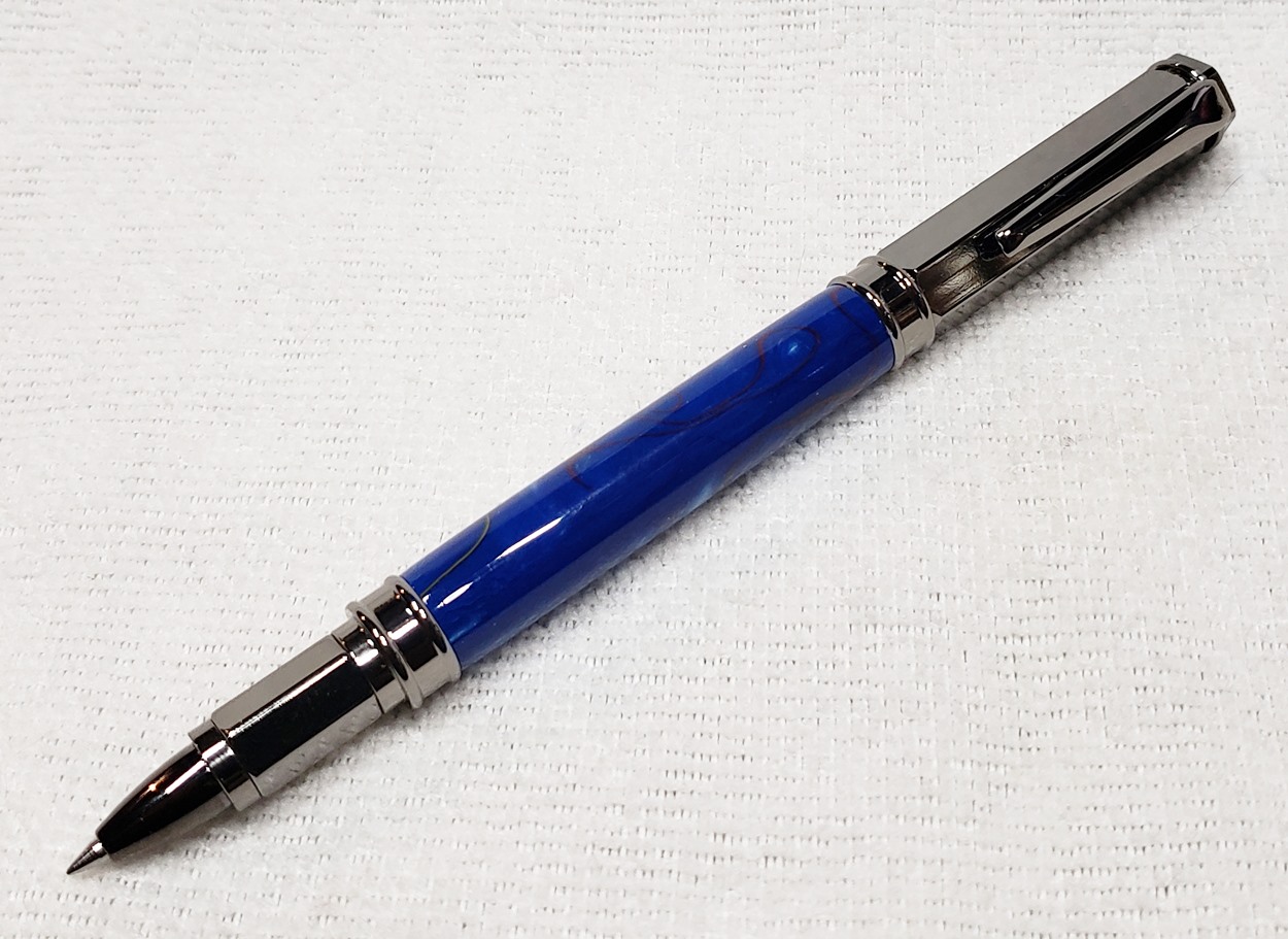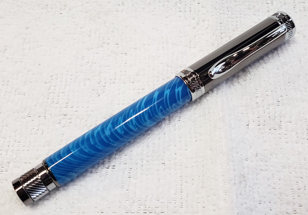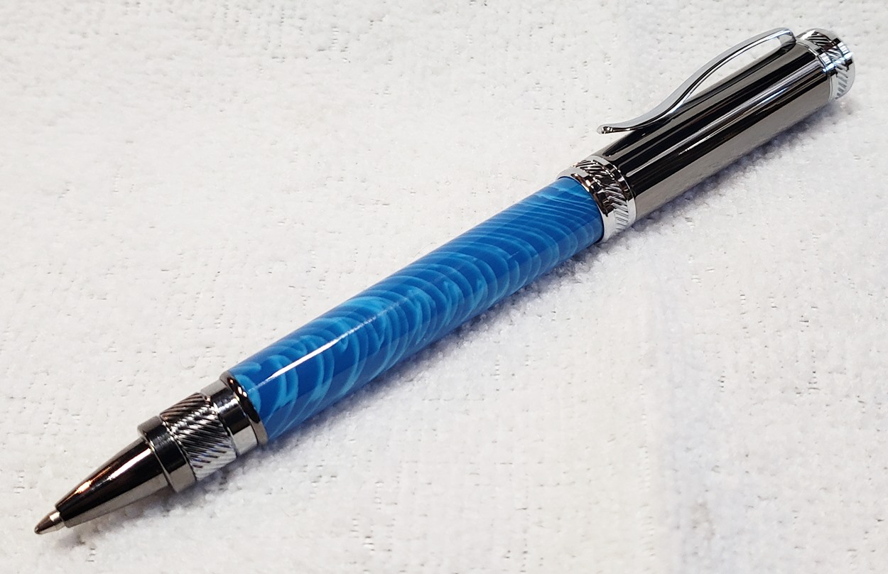 This is a PSI Magnetic Vertex rollerball pen, in gunmetal. I purchased it at Rockler. The blank is an Aquabright called Swirl Blue, from PSI. I believe Aquabright blanks are acrylic acetate, as they turn easily and polish nicely. I used my normal polishing routine: 220-600 grit sandpaper wet; 3M Tri-M-Ite polishing paper, all six grades, also wet; followed by Mequiar's 105 and 205 polishes.
