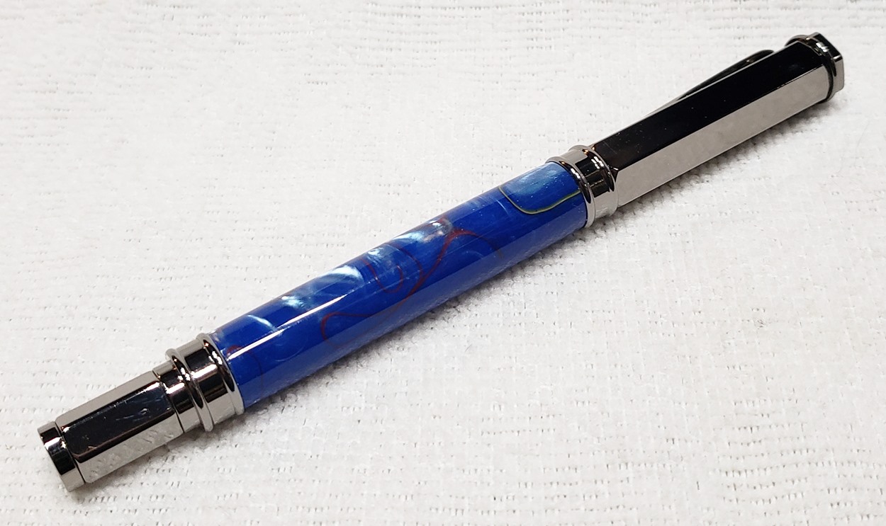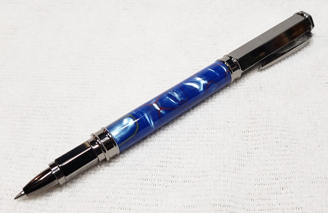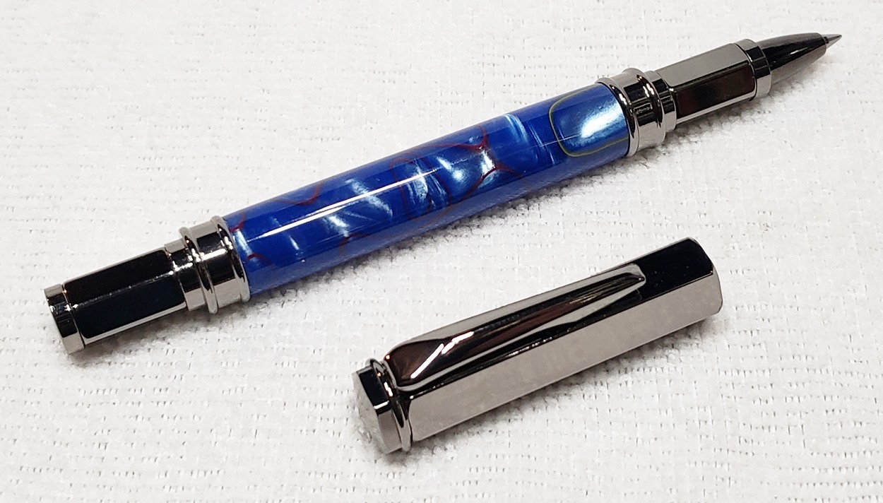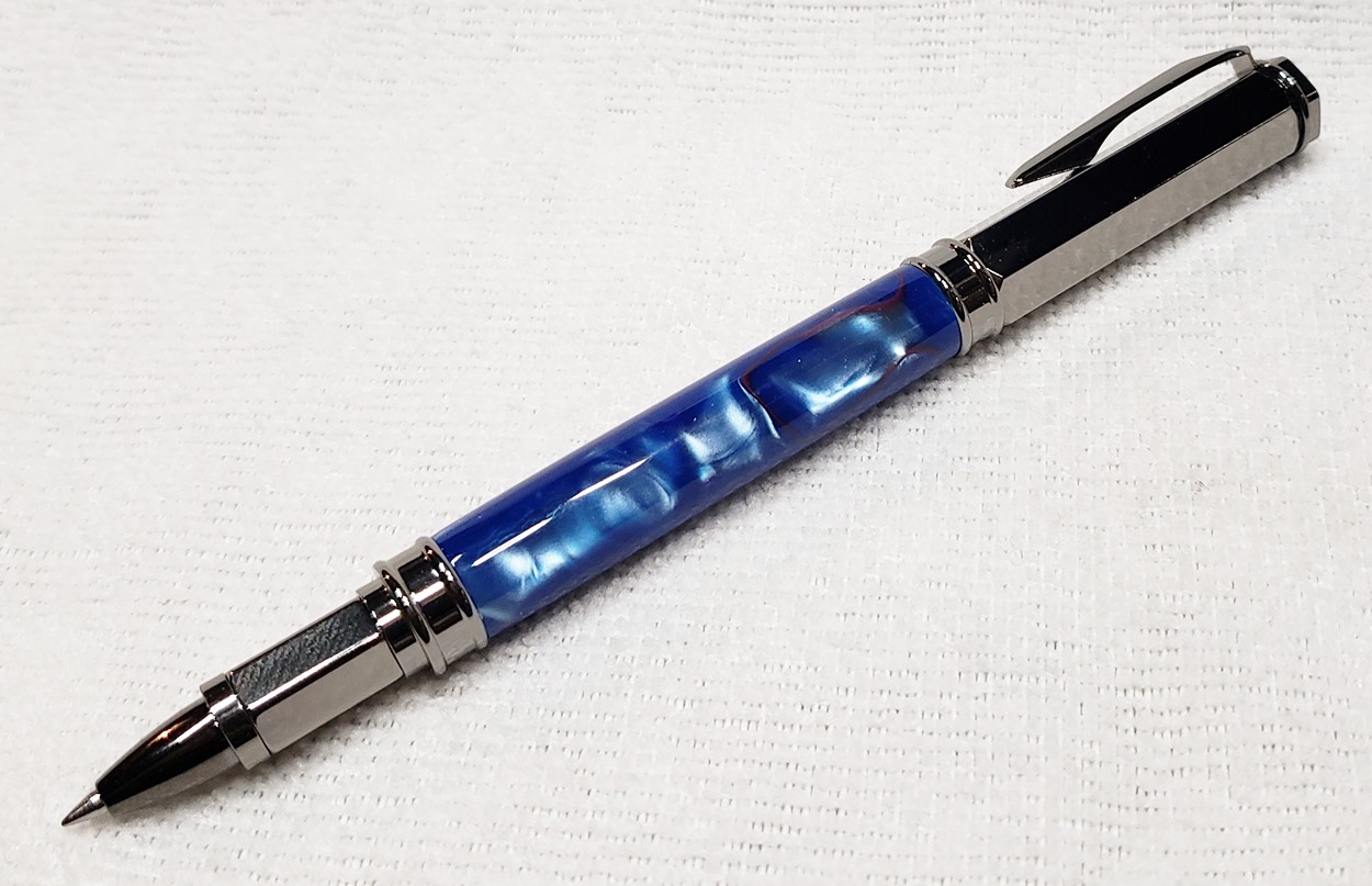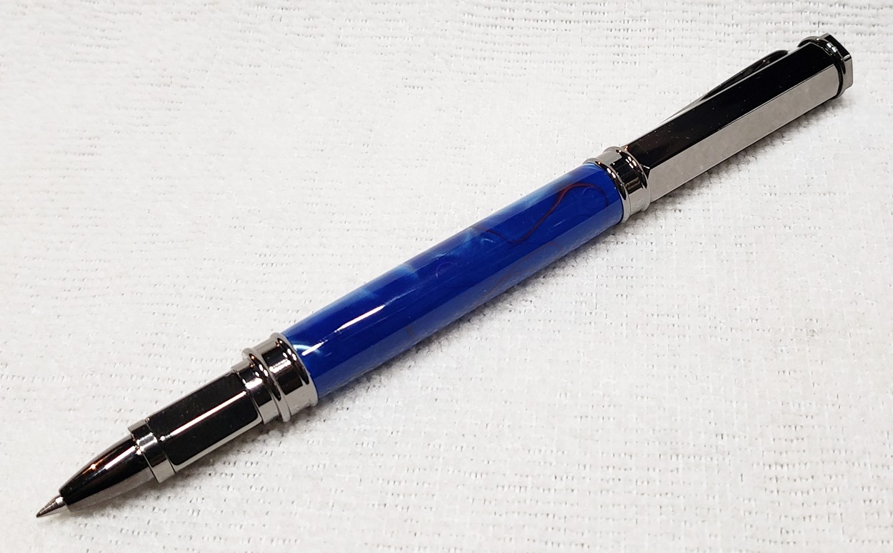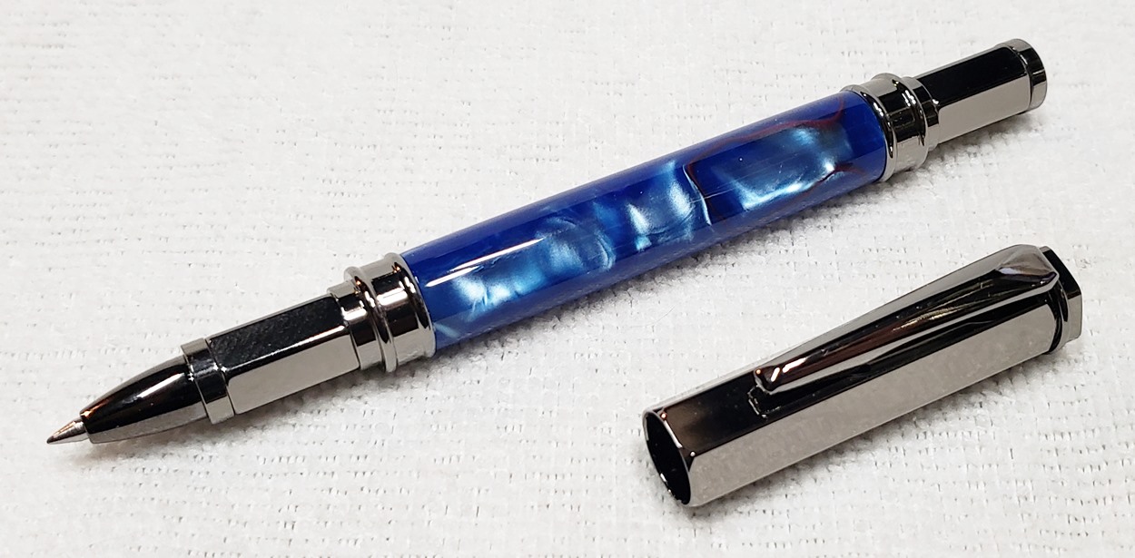 This is a PSI Magnetic Vertex rollerball pen, in gunmetal. I purchased it at Rockler. The blank is an Aquabright called Swirl Blue, from PSI. I believe Aquabright blanks are acrylic acetate, as they turn easily and polish nicely. I used my normal polishing routine: 220-600 grit sandpaper wet; 3M Tri-M-Ite polishing paper, all six grades, also wet; followed by Mequiar's 105 and 205 polishes.