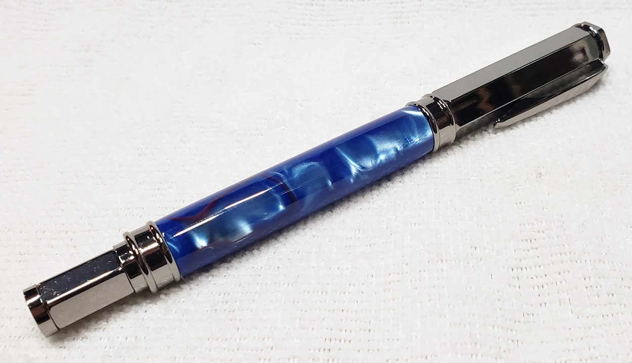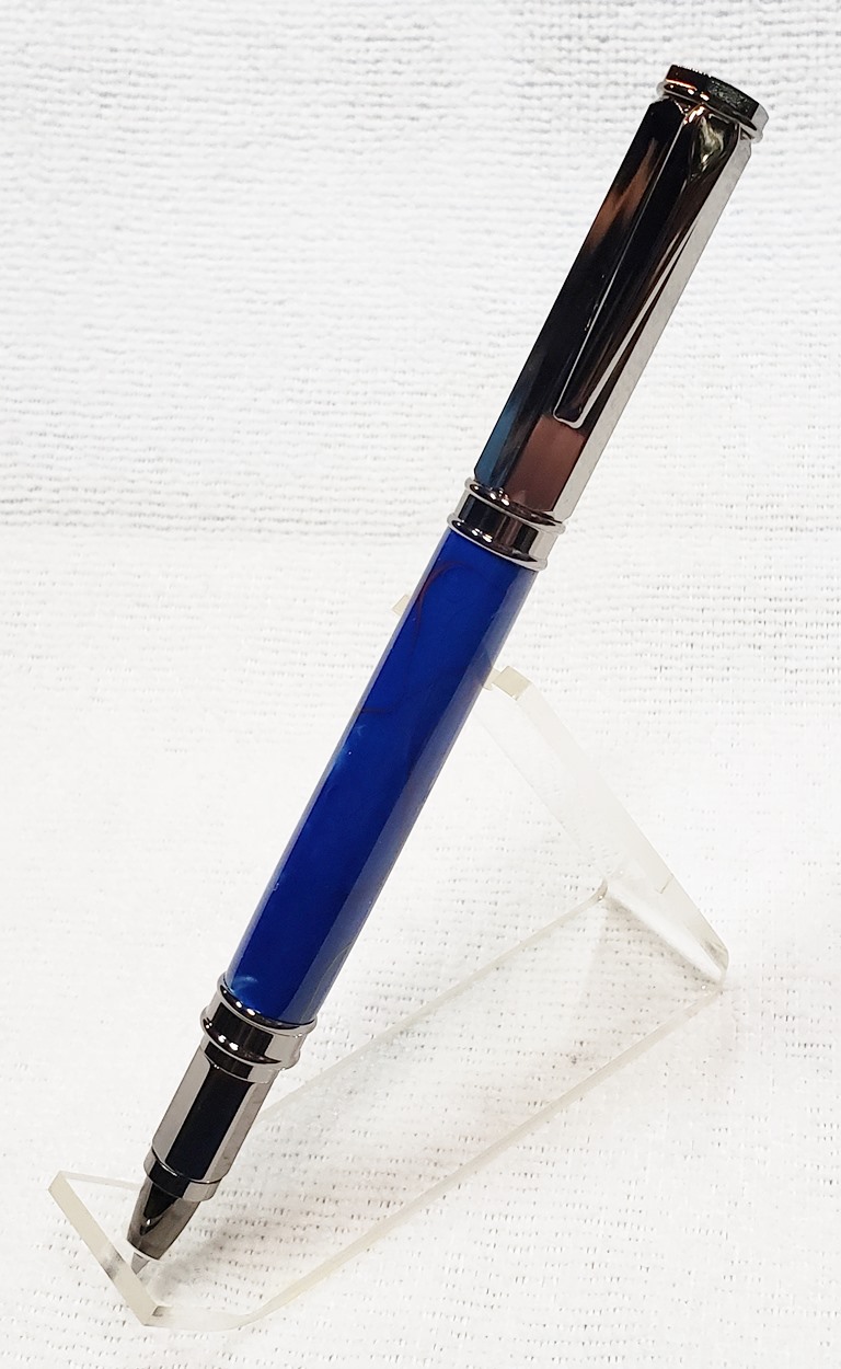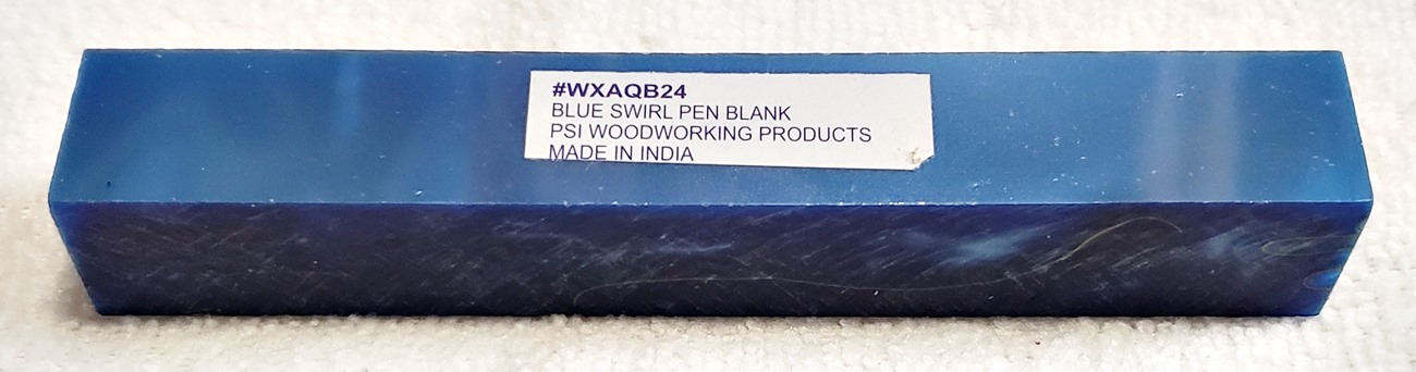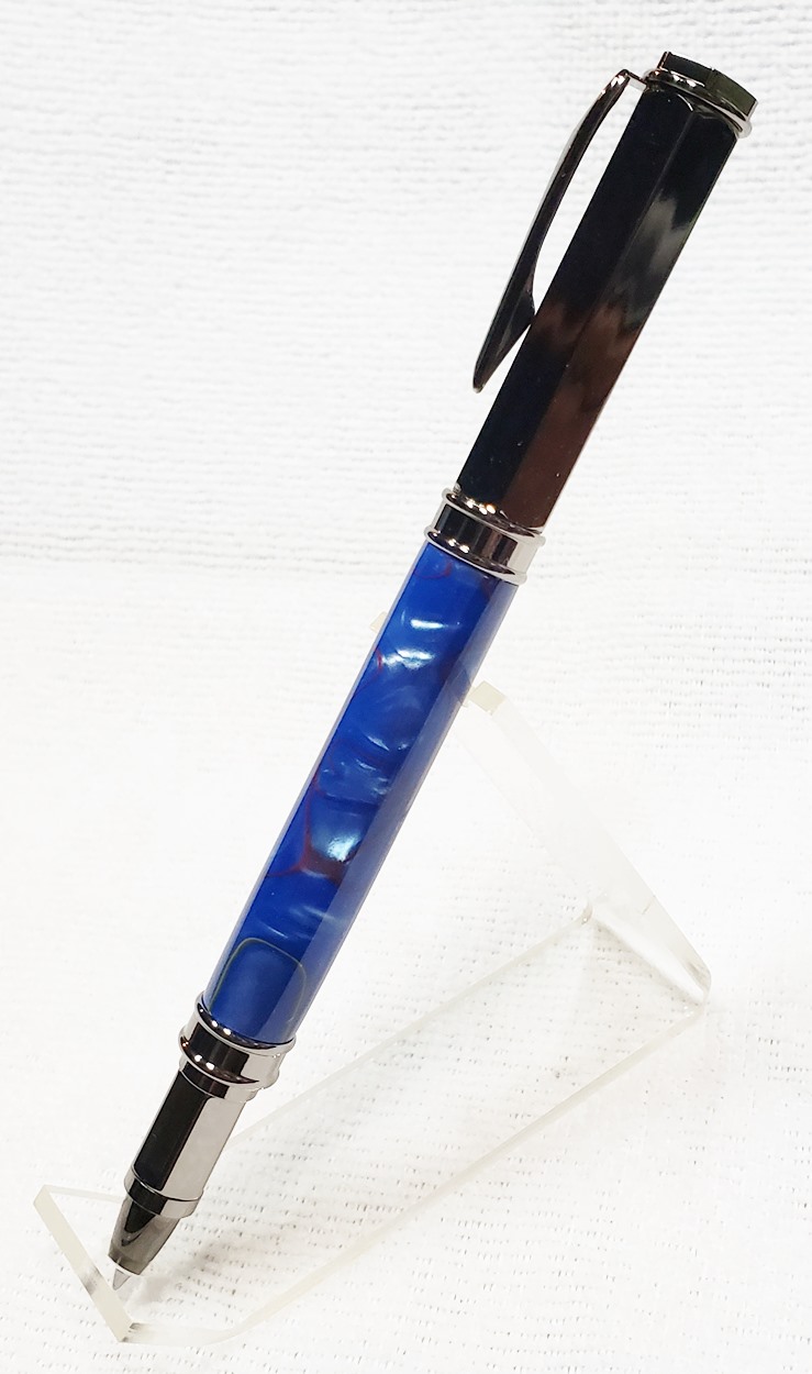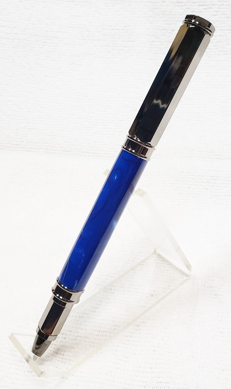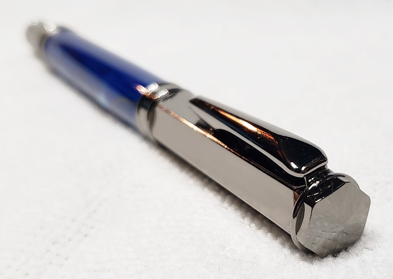 This is a PSI Magnetic Vertex rollerball pen, in gunmetal. I purchased it at Rockler. The blank is an Aquabright called Swirl Blue, from PSI. I believe Aquabright blanks are acrylic acetate, as they turn easily and polish nicely. I used my normal polishing routine: 220-600 grit sandpaper wet; 3M Tri-M-Ite polishing paper, all six grades, also wet; followed by Mequiar's 105 and 205 polishes.