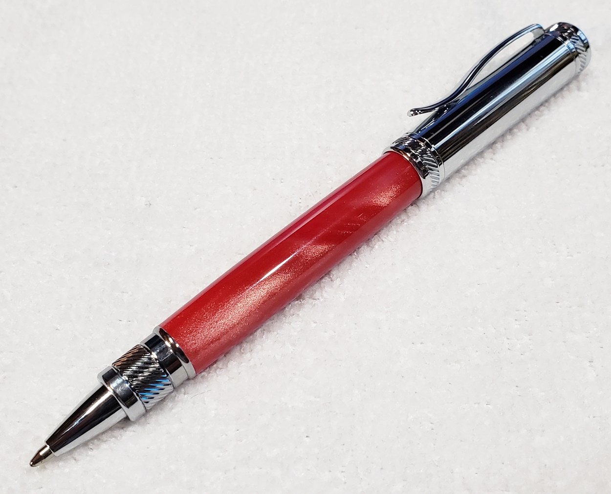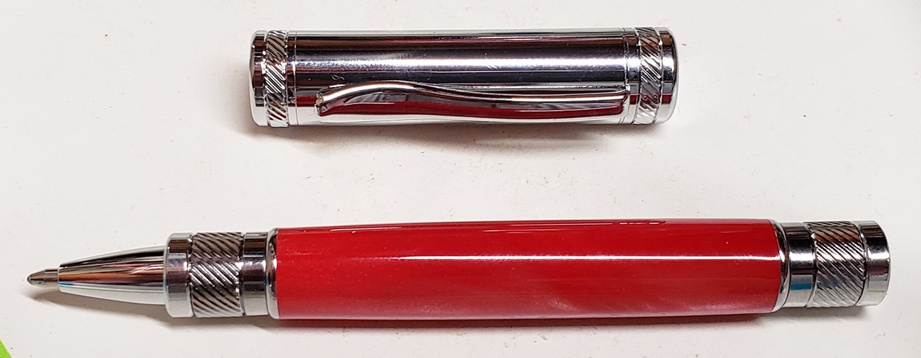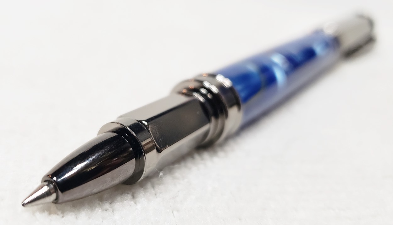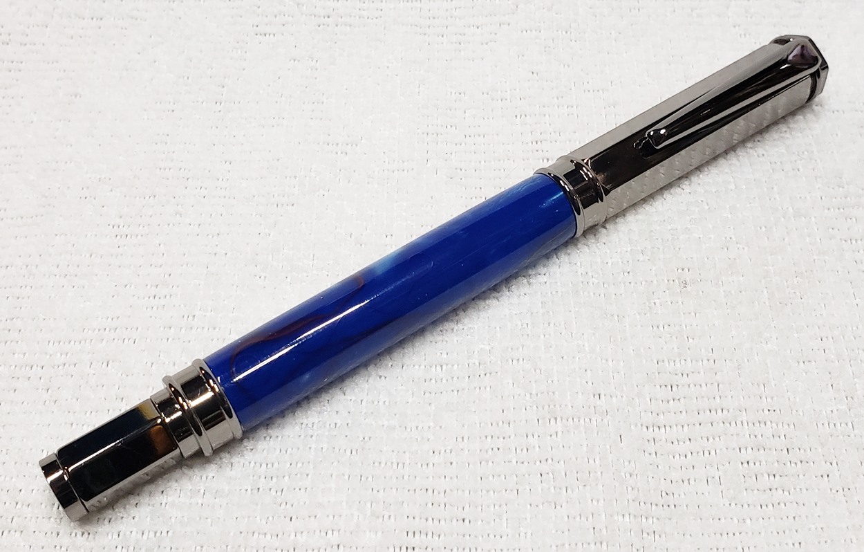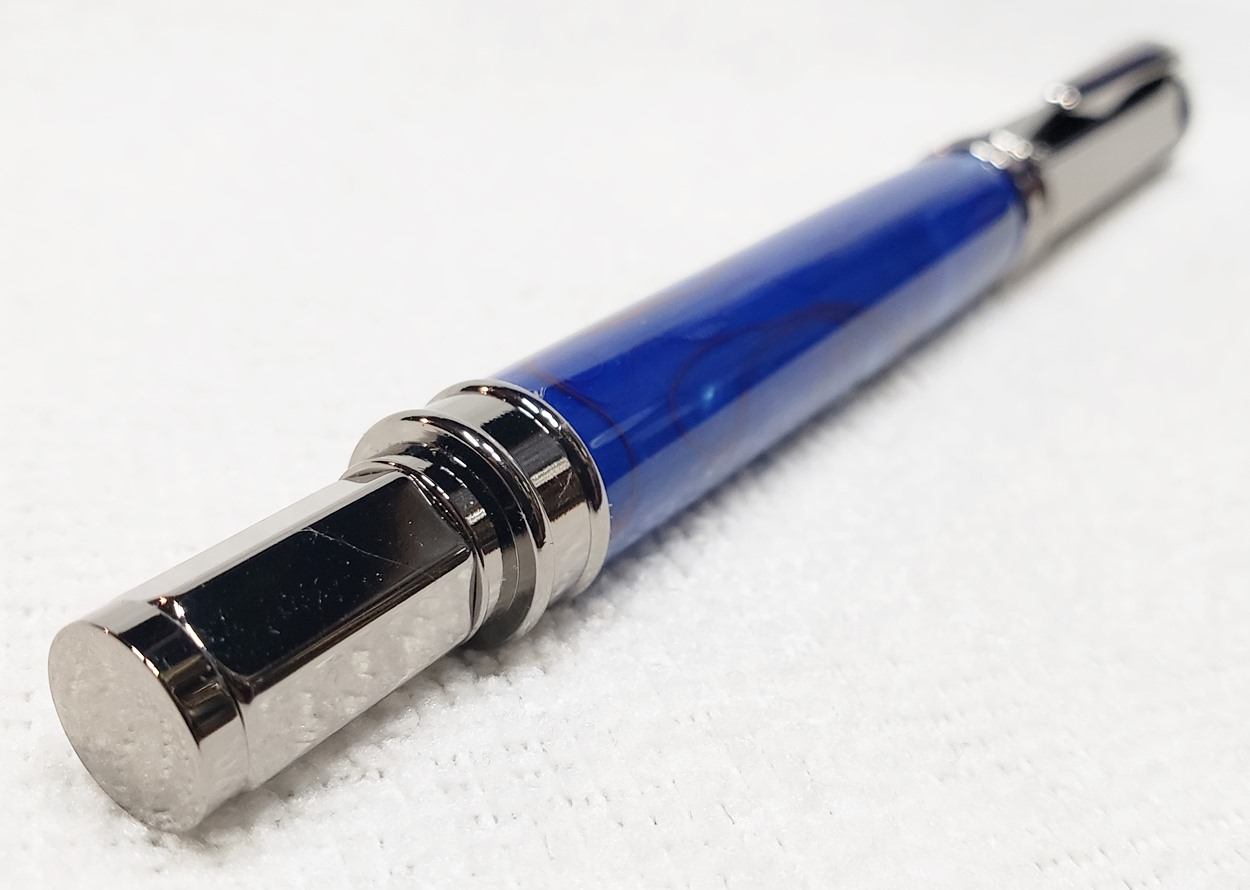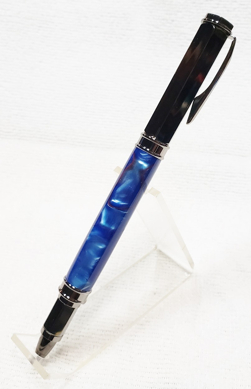 This is a PSI Magnetic Vertex rollerball pen, in gunmetal. I purchased it at Rockler. The blank is an Aquabright called Swirl Blue, from PSI. I believe Aquabright blanks are acrylic acetate, as they turn easily and polish nicely. I used my normal polishing routine: 220-600 grit sandpaper wet; 3M Tri-M-Ite polishing paper, all six grades, also wet; followed by Mequiar's 105 and 205 polishes.