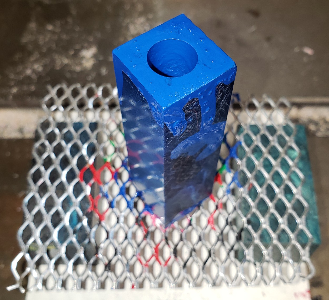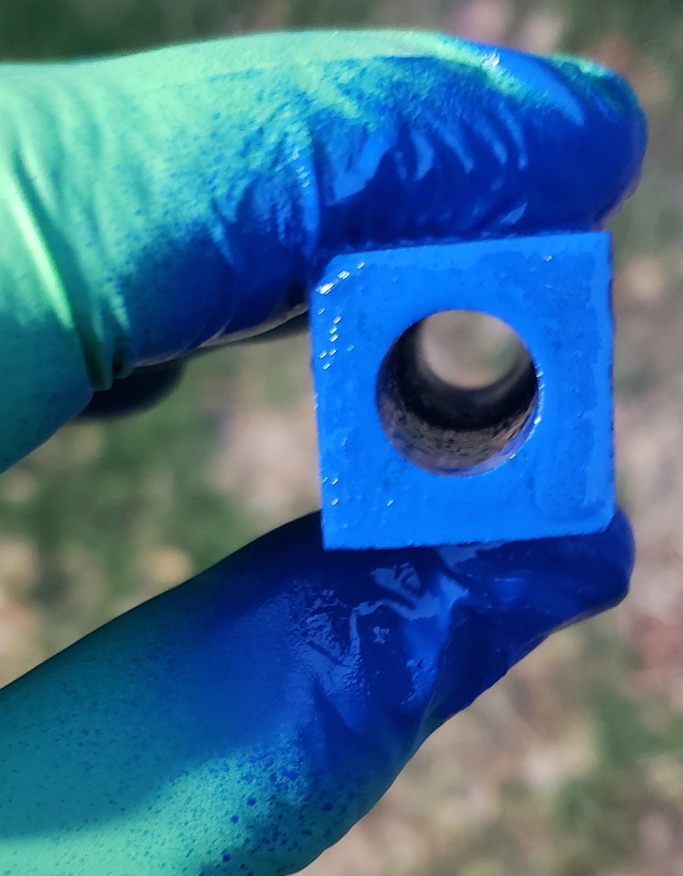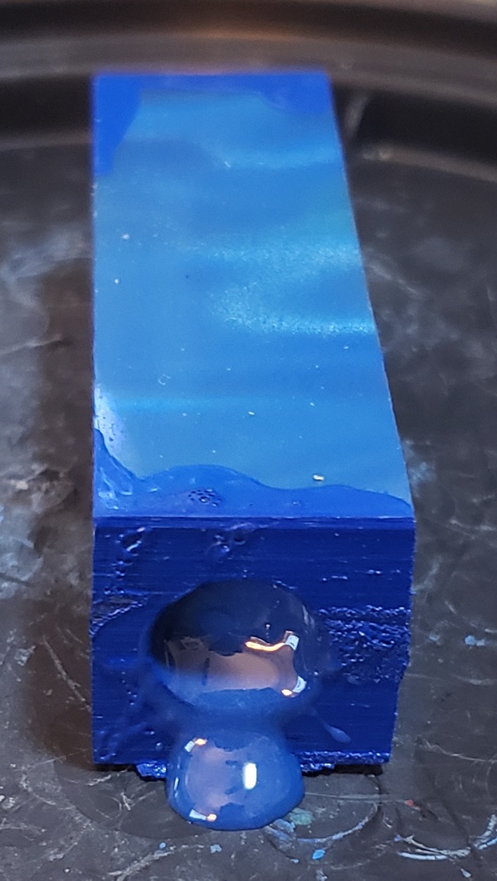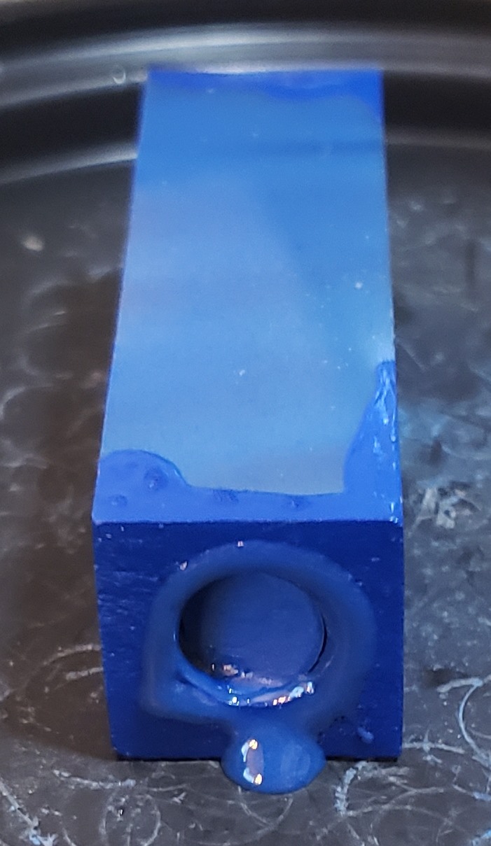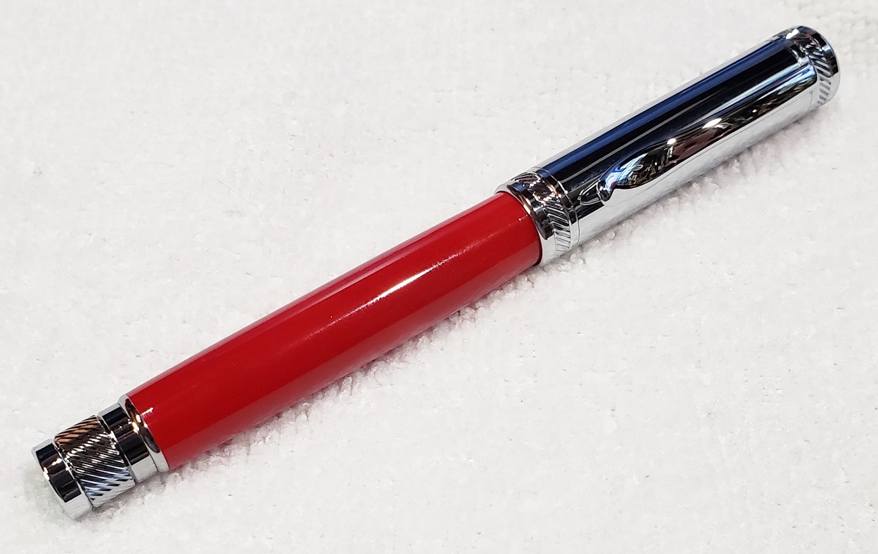 This is a PSI Magnetic Vertex rollerball pen, in gunmetal. I purchased it at Rockler. The blank is an Aquabright called Swirl Blue, from PSI. I believe Aquabright blanks are acrylic acetate, as they turn easily and polish nicely. I used my normal polishing routine: 220-600 grit sandpaper wet; 3M Tri-M-Ite polishing paper, all six grades, also wet; followed by Mequiar's 105 and 205 polishes.
