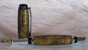 This is a piece of Mai Kair that I picked up locally from a great wood supplier here in town. He seems to find some interesting stuff, and thankfully there aren't a huge amount of turners here in Frederick, his turning stock is always in abundance:wink: It is impossible to photograph, but it has a very deep chatoyance that rivals a nice piece of Koa. Beautiful green and gold tones that shift in the light, and the effect is as if you are looking INTO the wood. It is dressing a Sterling Navigator and is finished with Mylands friction finish. This is more for personal use, and I personally prefer the feel of the wood over CA or Laquer. Just my own preference...