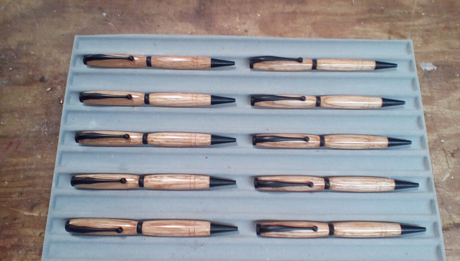 I just finished a 10 pen commission. Red Oak (firewood series) on a PSI Slimline flat black with a GluBoost finish. Looking at our wood pile I told my wife we're sitting on millions!