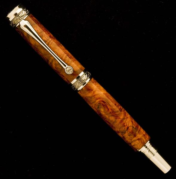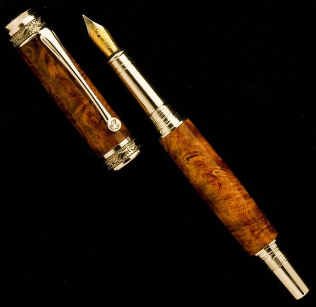Made it this morning. A Rhodium and Black T/N plated Majestic Junior Fountain Pen with Amboyna Burl Wood. Enjoyed turning it. Sanded to 600 grit. Cleaned with rubbing alcohol. CA medium X 8 coats. MM to 12000 followed by HUT plastic polish and a coat of Ren Wax. Comments welcome and, as always, thanks so much for looking. Hope everyone has a great day! Doc