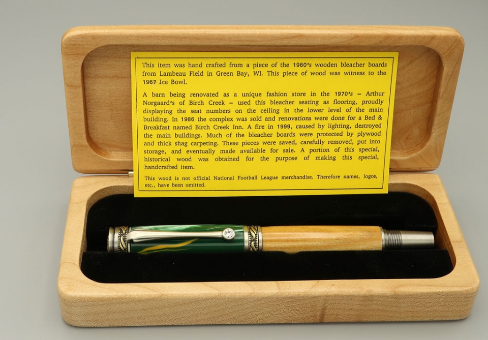 I always enjoy seeing the variety of pen blanks for sale by the members here at IAP. Back in January, I picked up some historic wood blanks from Matthew Sprunger (IAP name - Sprung), the Lambeau Field Bleachers blanks. Here's my contribution, a Majestic Jr in Antique Pewter/Antique Brass with a Bay Gold and Green Acrylic cap over the Lambeau blank.