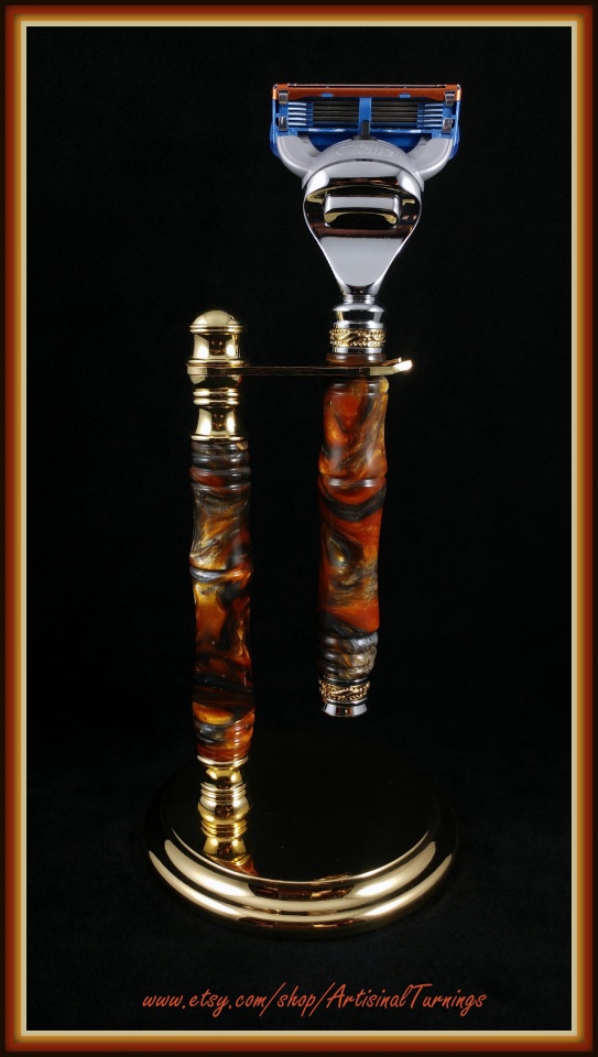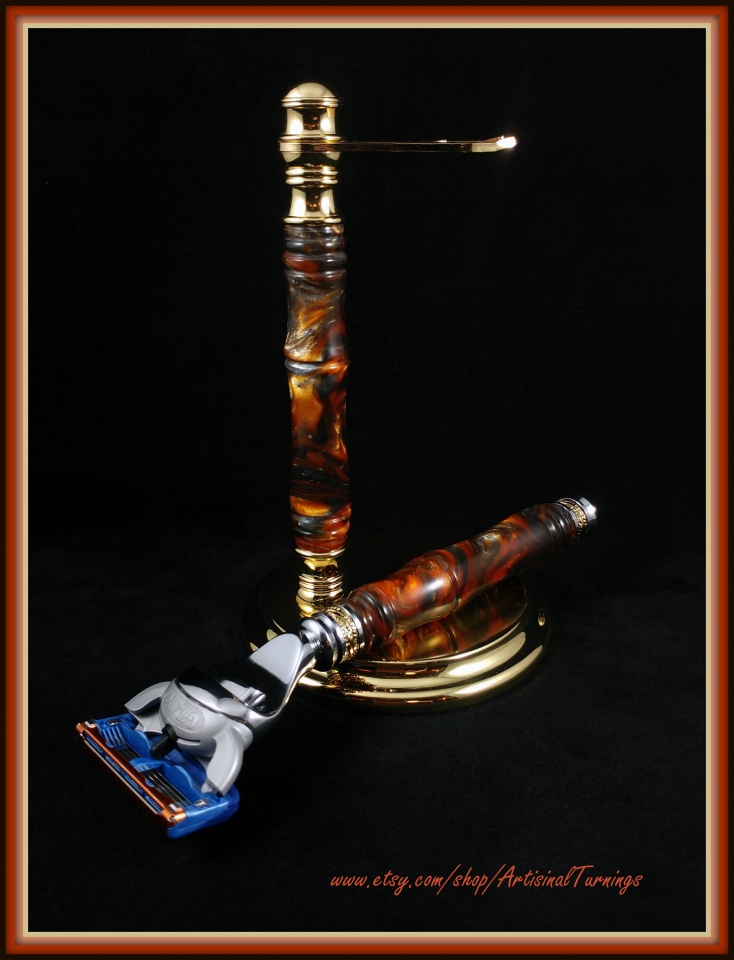 This Majestic razor goes nicely with the gold plated razor stand as does the Molten Metal blank which is one of my favorites. Someday I'm going to try to replicate it, but I didn't have time to experiment with a 4 color pour for this custom order which was for a birthday next week. I discovered that the Majestic razor isn't designed to fit on a razor stand arm, it's too wide. So I had to make a larger cove on the handle so the arm could slide into it. Of course I didn't realize this until I had finished the razor. :frown: