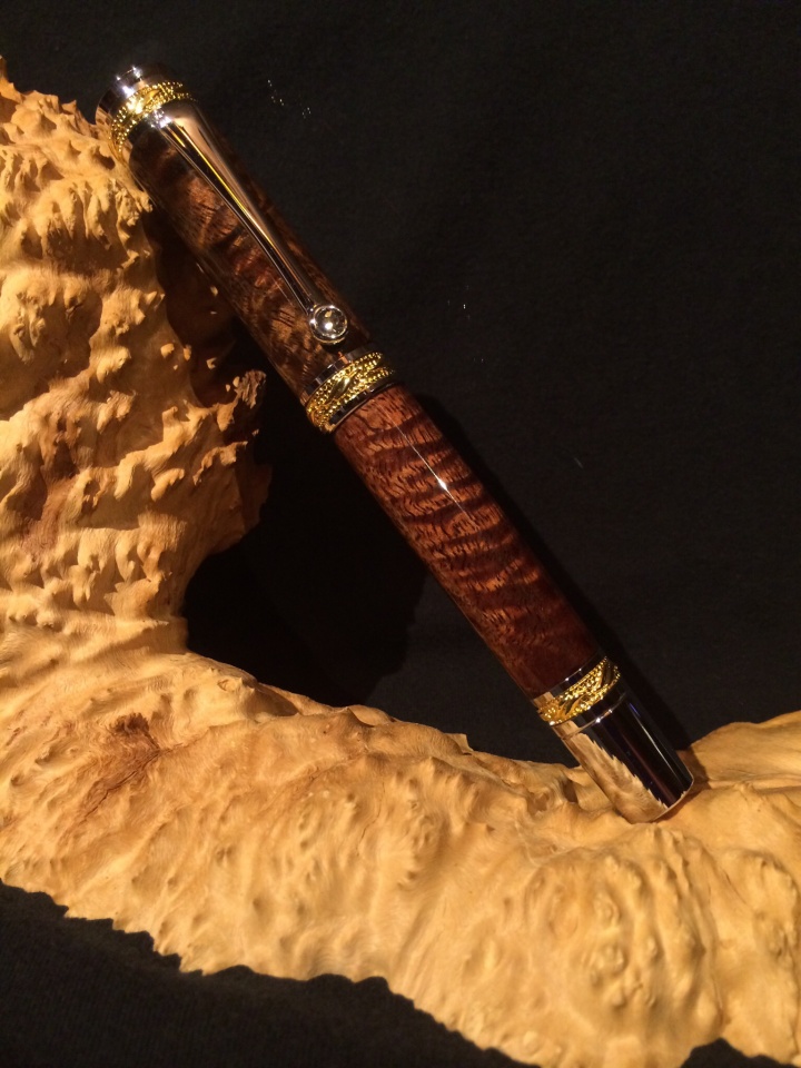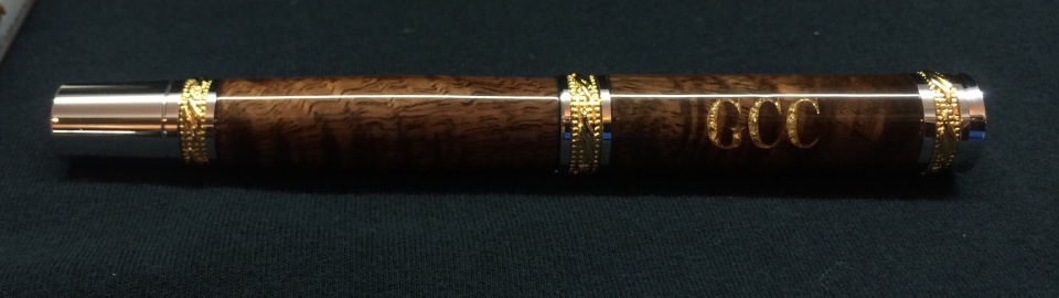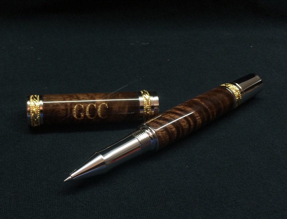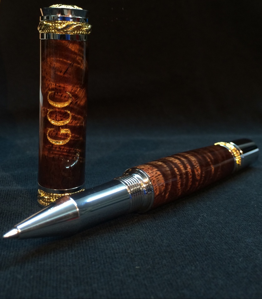 Had a customer request a Majestic to give as a Christmas gift. She had seen my curly Koa Majestic fountains, loved the wood, and wanted a roller. Also wanted initials for the recipient engraved in the wood.
