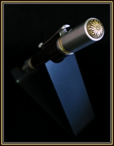I paired this Majestic Squire in Antique Brass with a Woodcraft Blue Spectraply blank. It's surprising how nice this fancy piece of plywood turns out. Polished up to 400 grit, wiped with BLO, then multiple coats of thin CA glue applied to a piece of shop towel after adding a drop of BLO (roll the towel and cut into 1/2" strips; use a clean surface with each application). Apply and burnish each layer at 1500RPM until the CA warms and takes on a sheen. Quick polish with MeGuiar's "PlastX". Easy peasy!