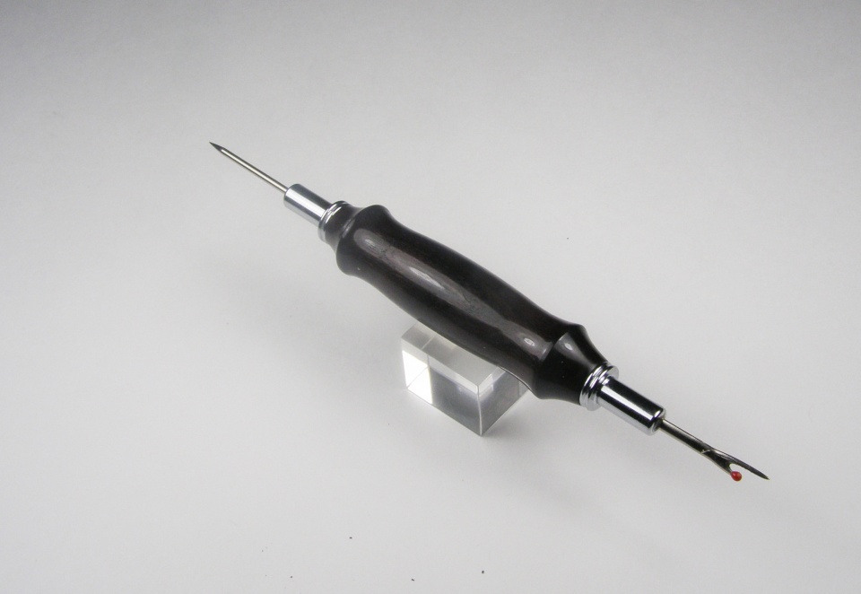 Beautiful seam ripper Ben! Bet your bride is going to love it! BTW, is it from a kit and if so, where did you purchase it? I've seen several kits for sale and others that were made from seam rippers from Walmart, Michaels, etc. The wood looks like ebony or some other dark wood like walnut, very pretty and I really like the shape...VERY nice turning!!! Thanks for sharing and safe turning to you!