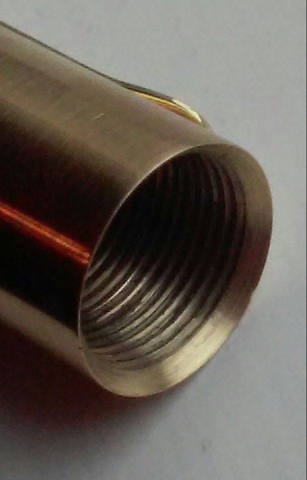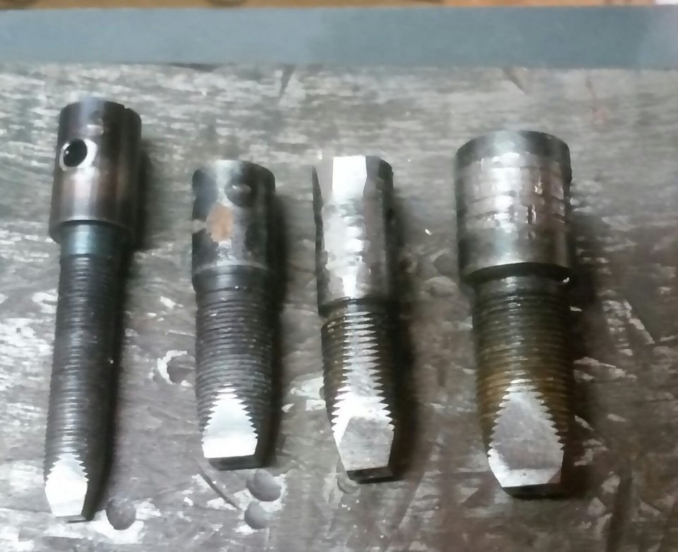 I needed a tap for a Bock 5 mm triple nib unit and didn't want to spend $40-$50. So I chucked up some 3/8" drill rod (W1) and turned it down to 0.253" and cut threads at a 0.6 metric pitch. Heated with a MAPP torch until it was no longer magnetic and quenched in water. I then ground a taper on the tip every 90 degrees. Works great in aluminum, brass, 304 SS, acrylic, and ebonite. Worked so well I made 8.5mm x 0.6, 9mm x 0.75, and 11mm x 0.75. Those worked for aluminum and brass but struggled in the 304 SS. Also much stronger than traditional taps with most of the cross-section milled away.