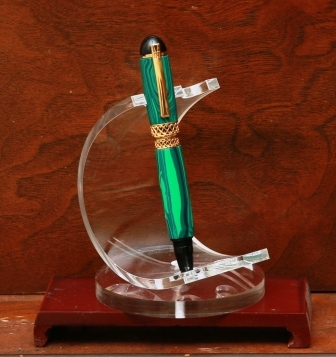 I also have trouble when drilling with large diameter bits, sometimes acrylics get too hot and actually warp in the pen blank press. I will try 7 mm pilot holes also. Go slow and be patient. And I have slowed the drill press down; but, may slow more. Here is an Apollo Infinity in malachite that my wife made.