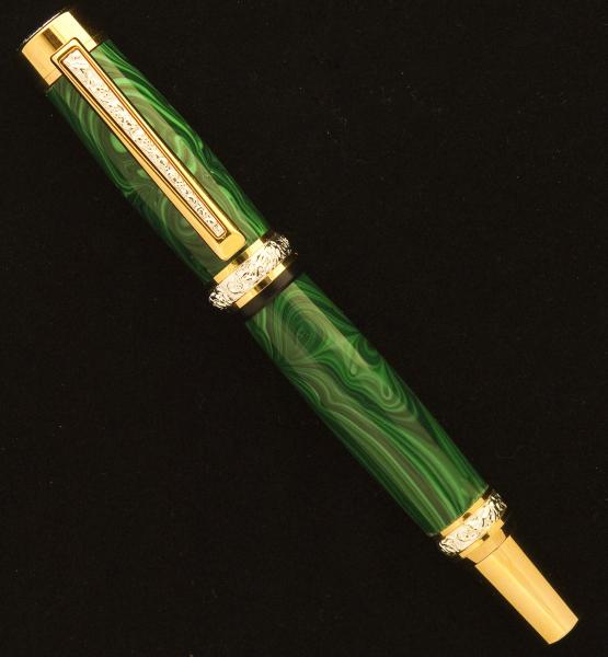 The material is called Tru-Stone and consists of an actual stone and resin mixture. This particular blank is Malachite and was obtained from CSU in 7/8" X 7/8" X 5" blanks. Turning them is very similar to turning acrylic. Need sharp tools. Go slow. The kit is a Cambridge Woodcraft Gold fountain pen with Sterling Silver Accents and is available at Woodcraft stores. I personally like the fit of the kit. It's one of the high end kits from Woodcraft. This particular blank material is opaque enough that there is no need to paint tubes or blanks.