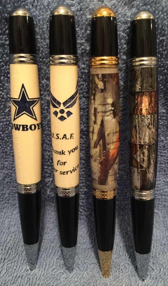 Decided to work on a few pens this afternoon. Three of the blanks that I used (USAF, Cowboys, & Steampunk) came from my winnings during the 2015 Super Bowl Contest. Thanks for the members sending me these blanks. Sorry I do not remember exact names without taking time to research through some of my notes. The New Orleans civil war blank was purchased from one of our IAP members in Arkansas.