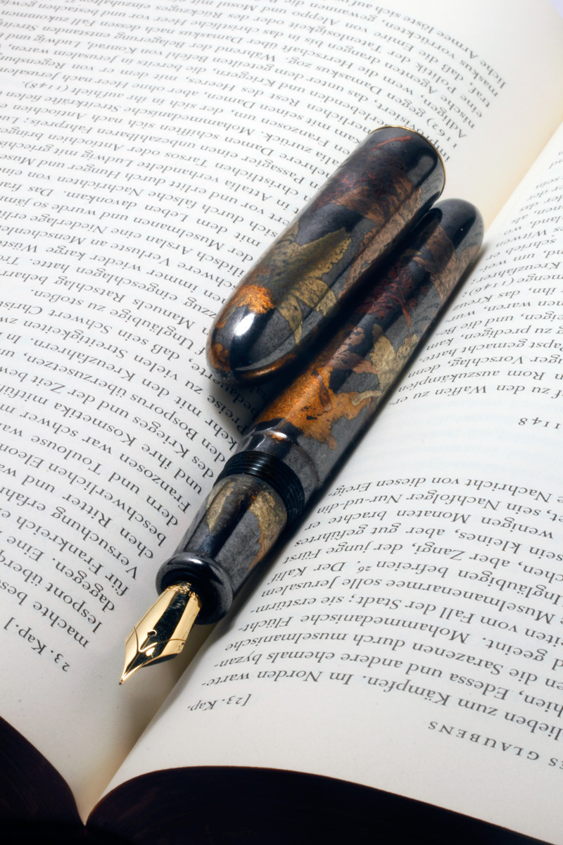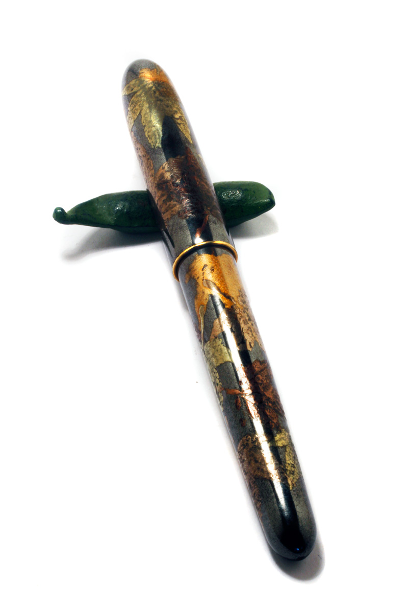 On an iron lacqquer ground maple leafs "Momiji" are brushed and sprinkled with powders of gold, silver, tinn, brass and bronze. The surface is polished at the end