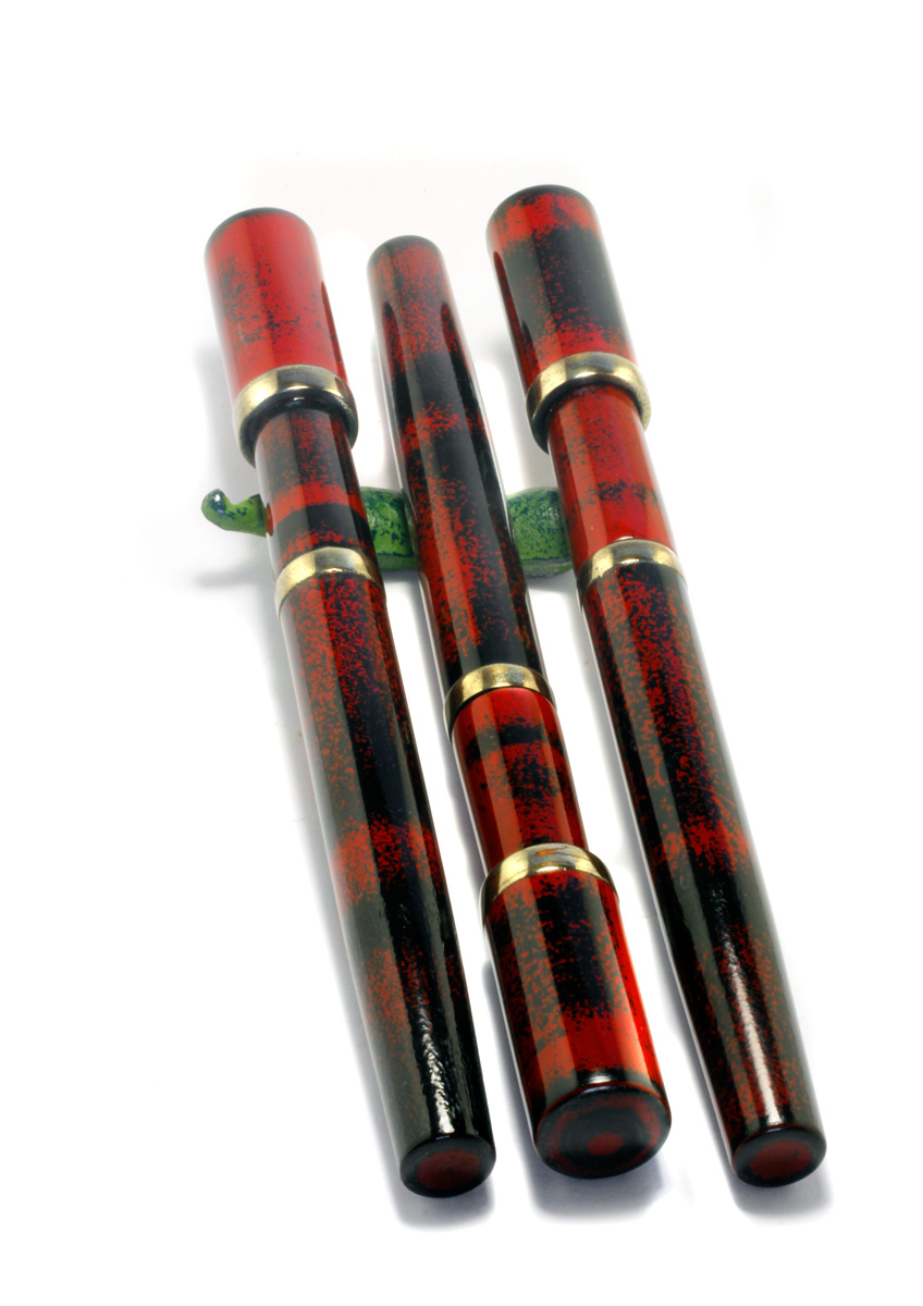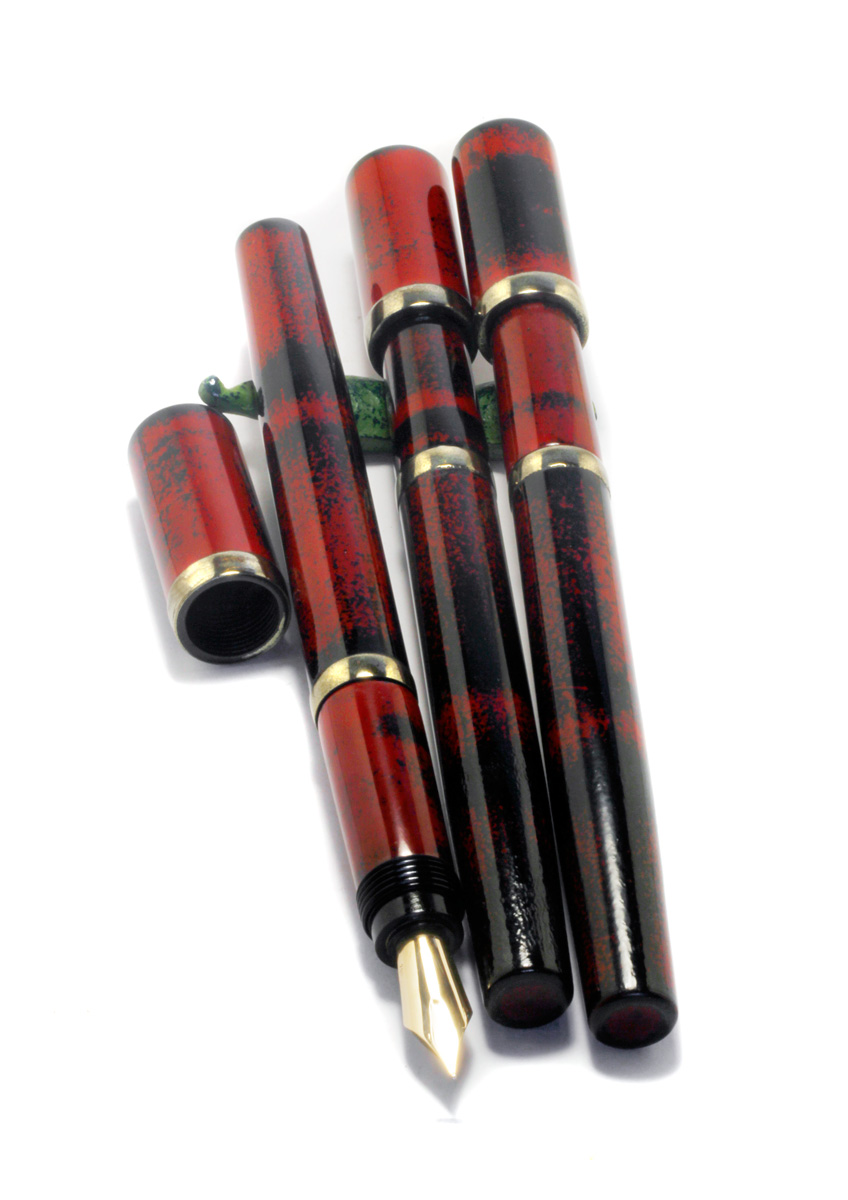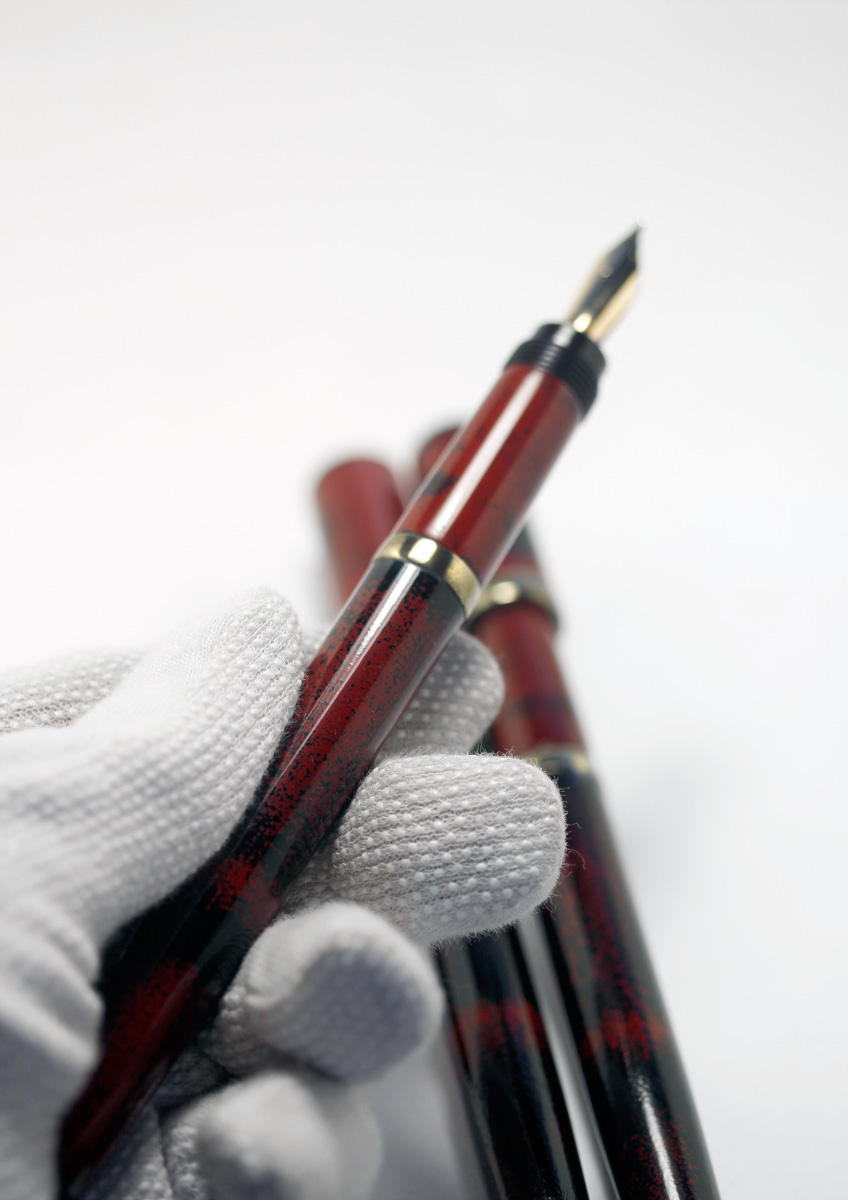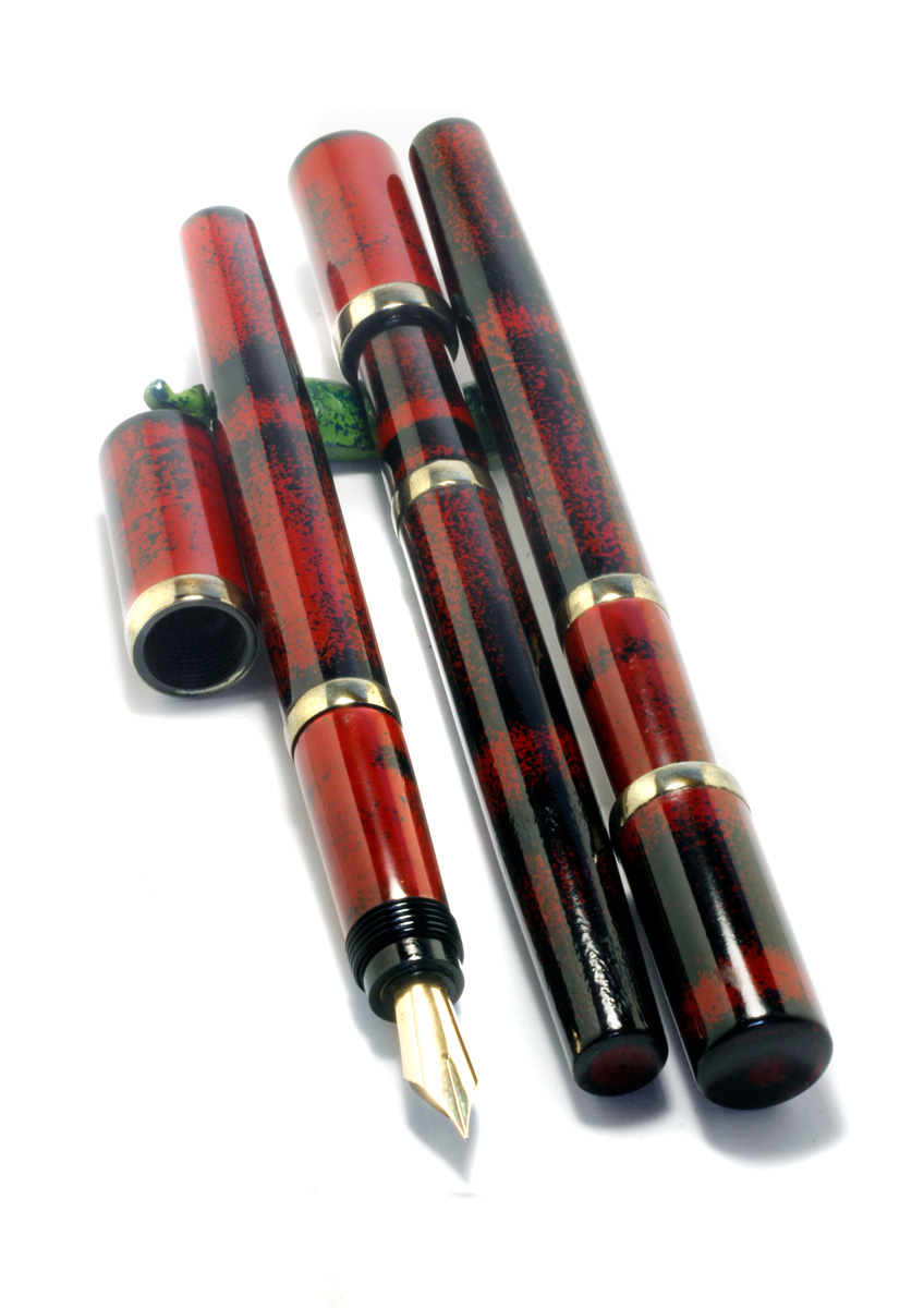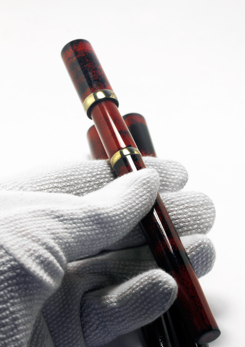 I have just started making small serials of pens with designs inspired by Vintage pens from the past. The Vintage/I is made in a serial of 10 pieces, Ebonite body with «Negoro» Urushi Lacquer. The metal fittings «Kinsokumiatateai» simulate solid brass, achieved by brass powder and urushi lacquer