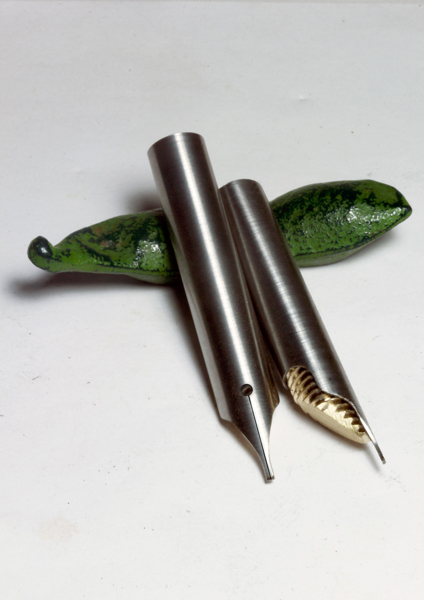 Over the weekend I have realized a new project, making nibs from a 9 mm diameter stainless steel tube and a feed made from a 8 mm diameter Brass barr with a simple thread instead of a classic comb. I am surprised how well the nib and feed work.