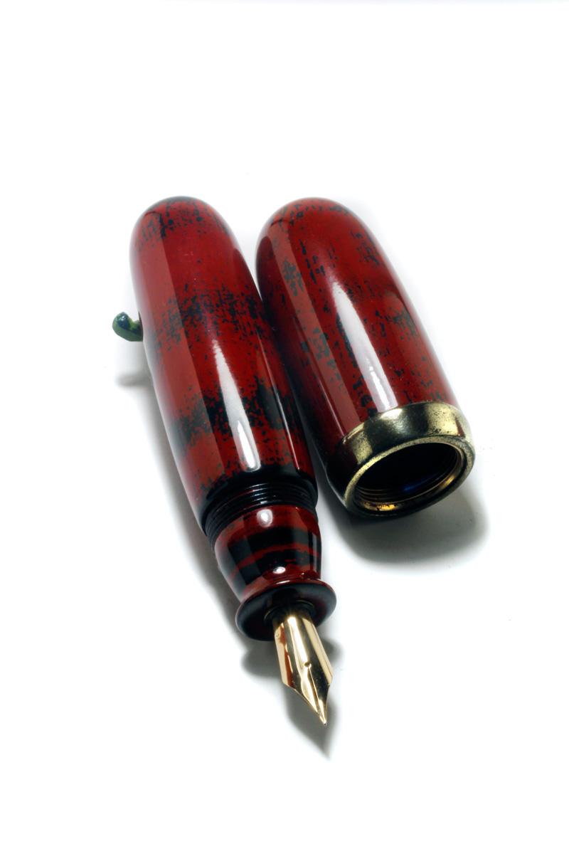 The pen body manufactured from Ebonite. Total length: 120 mm, length barrel with nib 115 mm, diameter barrel 24 mm, Diameter cap: 27 mm. The golden band on the cap is made from urushi and brass powder (Kinsoku Mitateai) to imitate hammered solid brass. The case made from Aluminum with an ebonite lid and lacquered with urushi.