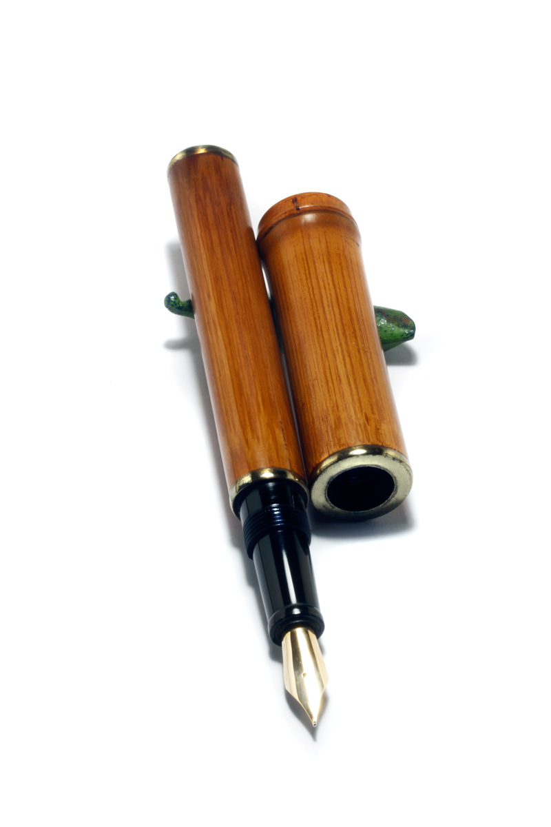 Just finished a new Bamboo Fountain Pen made from natural material with rings and end pieces "Kinsokumitateai" made from urushi and brass powder to look like solid brass fittings. The section Japanese black-brownish Ebonite, #6 gold nib. The bamboo inside and outside sealed waterproof with urushi "Fuki Urushi".
