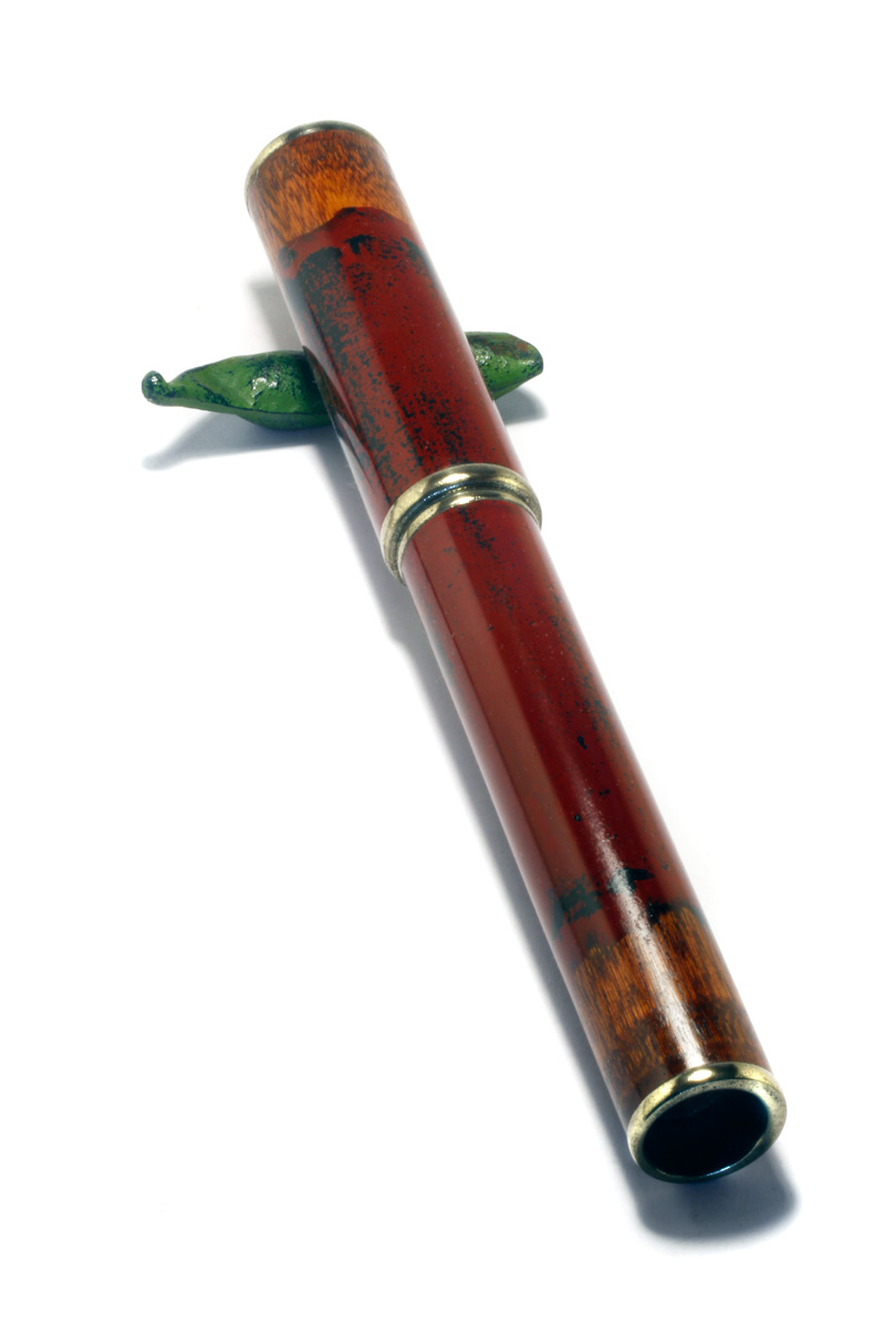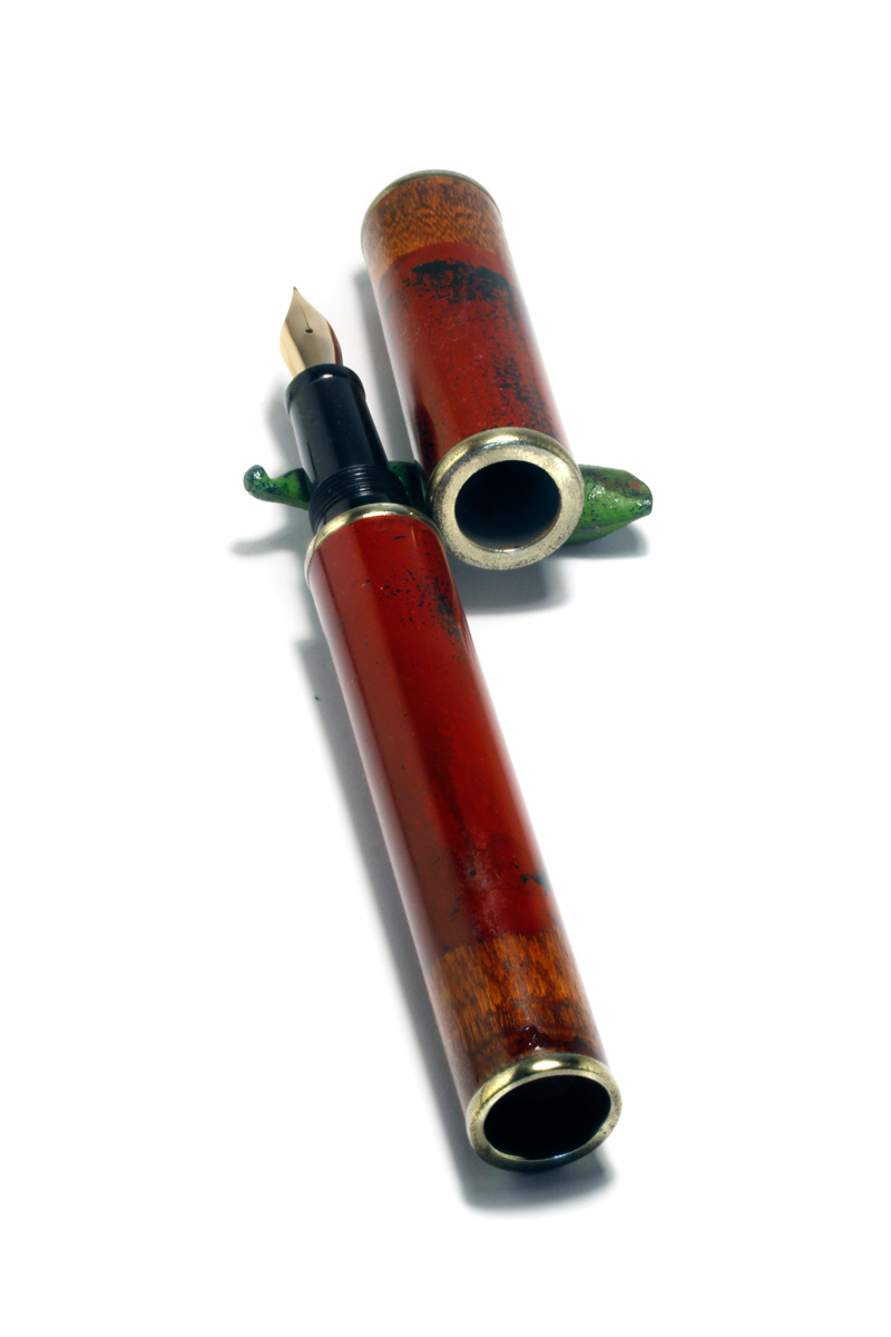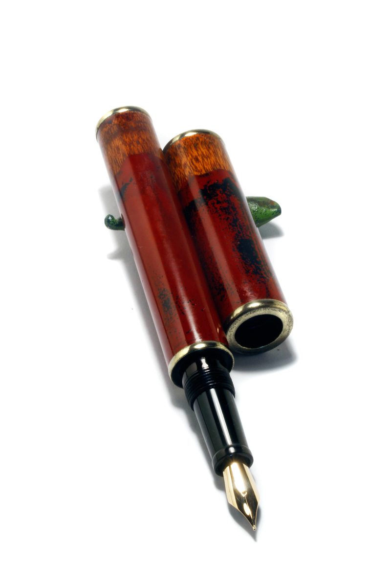 A new Bamboo Fountain Pen made from turned material with rings and end pieces "Kinsokumitateai" made from urushi and brass powder to look like solid brass fittings. The section Japanese black-brownish Ebonite, #6 gold nib. The bamboo partially lacquered in "Negoro Nuri" Urushi lacquer.