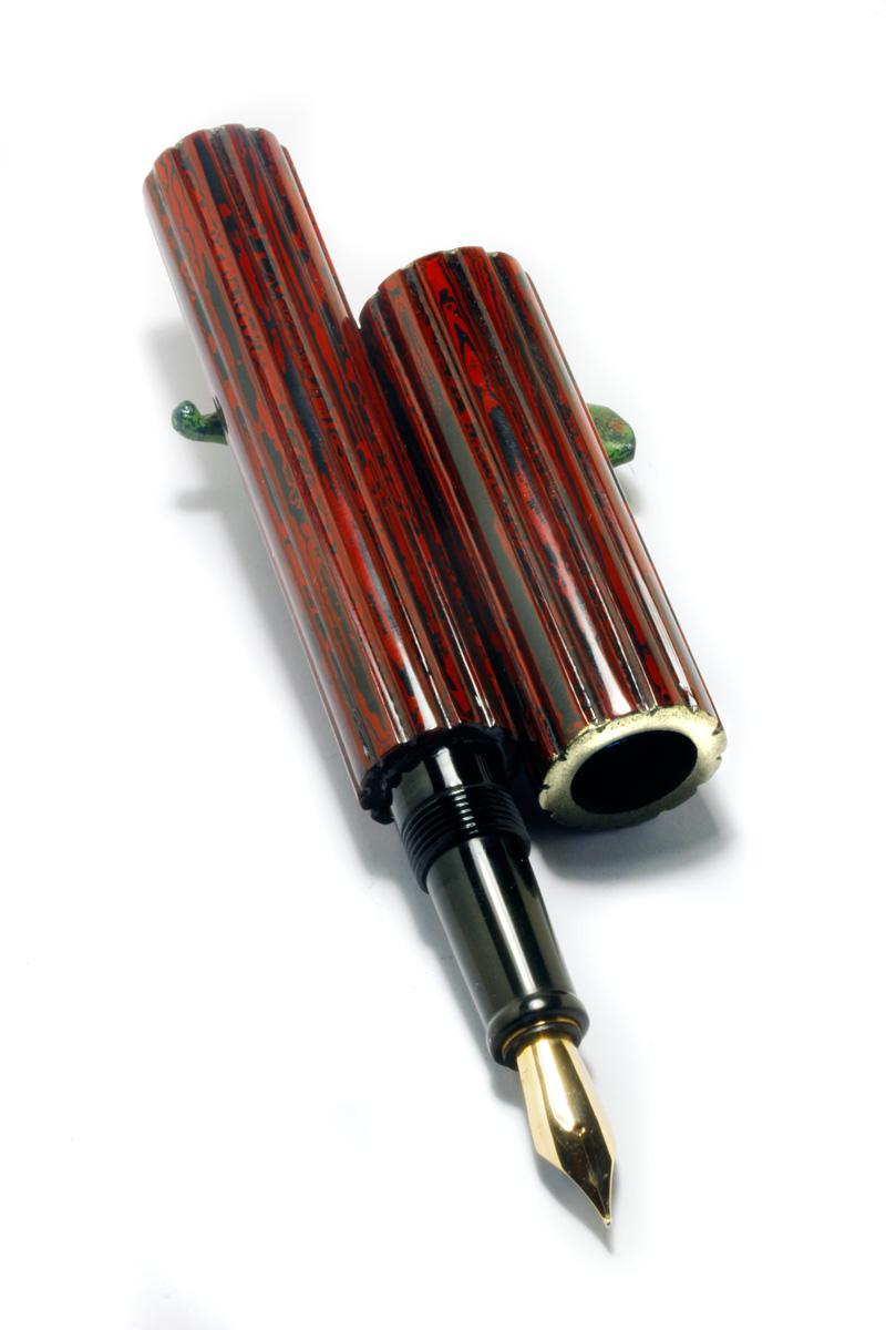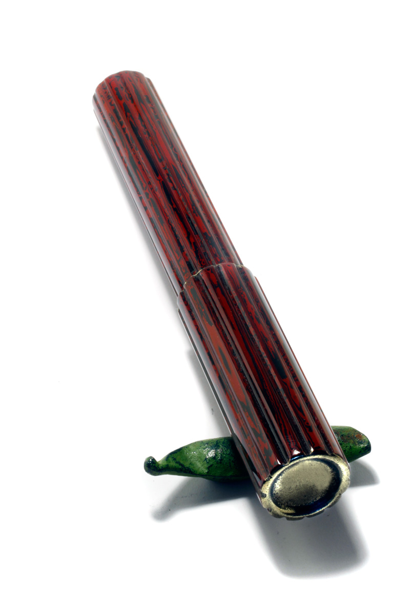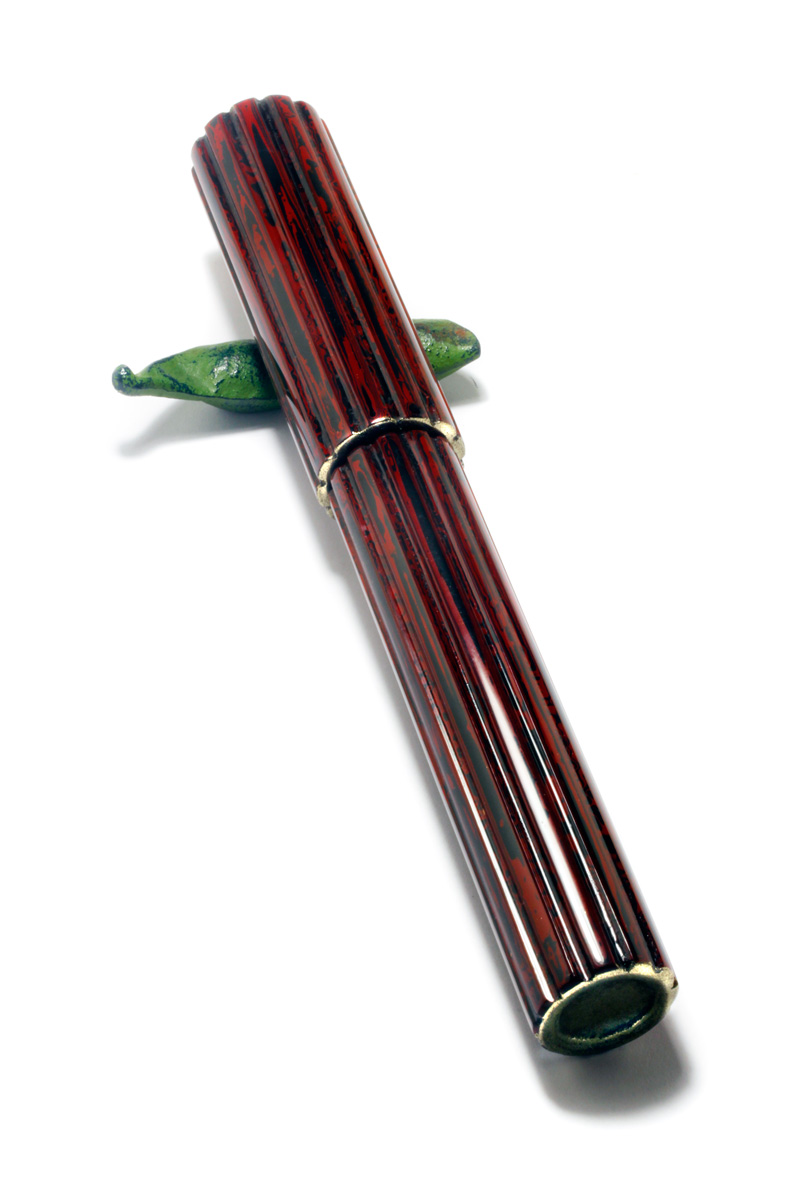 A Bamboo Pen made from turned Bamboo material, rings and end pieces "Kinsokumitateai" made from urushi and brass powder to look like solid brass fittings. The section Japanese black-brownish Ebonite, #6 gold nib. The cap and barrel fluted and alternately lacquered with red and black urushi lacquer to produce a marble "Dairiseki" like pattern, Weight 25 grams