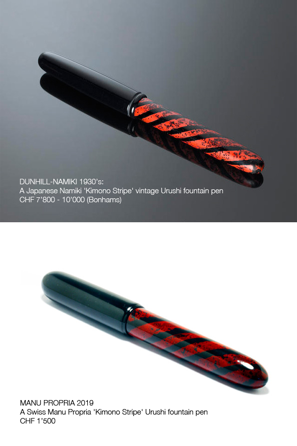 I recently noticed that Bonham's offers a Dunhill Namiki Fountain Pen from the 1930's with an interesting "Kawarinuri" experimental Urushi lacquer. The description says rather amateurish that its Maki-e but it's a Kawarinuri.