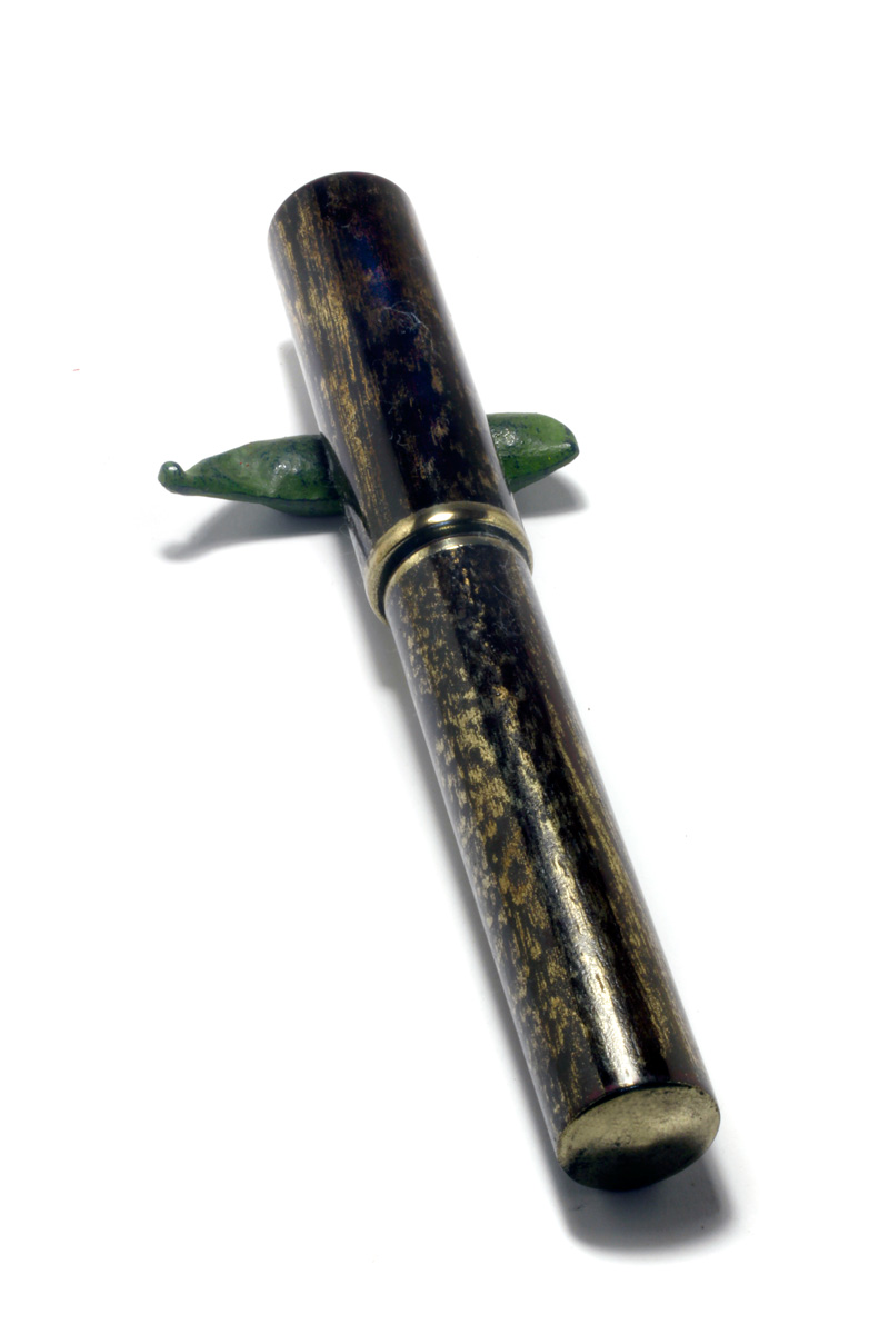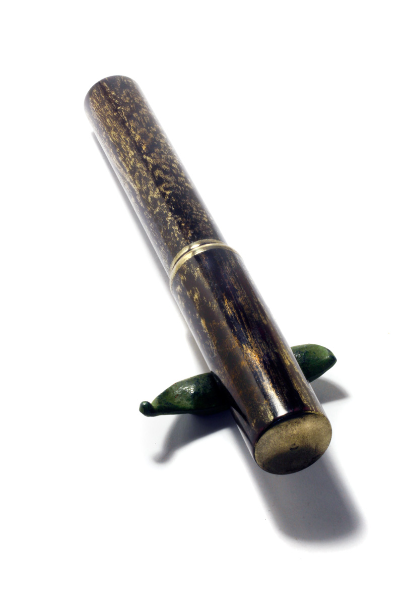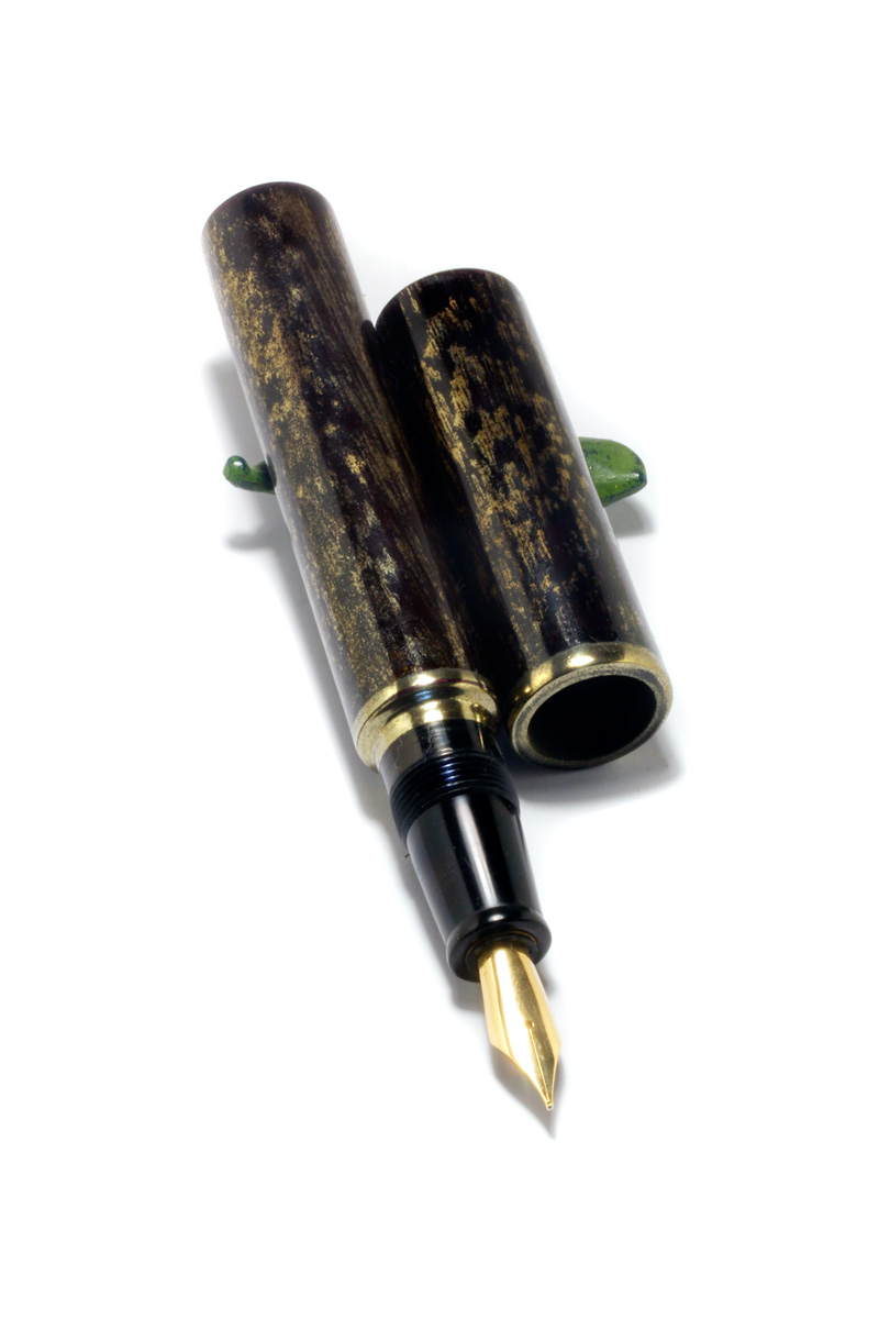 A Fountain pen, made from pink Redwood with "Fuki-Urushi" and a treatment in which the pores/graines of the wood is filled with gold powder, a sort of natural "Chinkin". The fittings all urushi and brass powder.