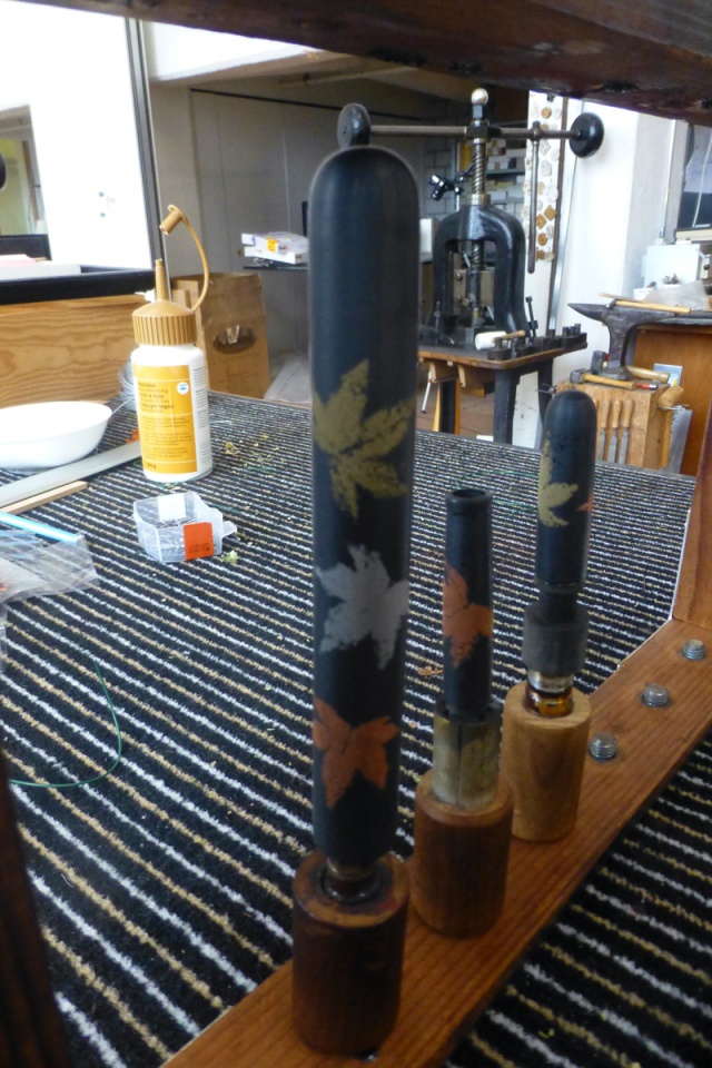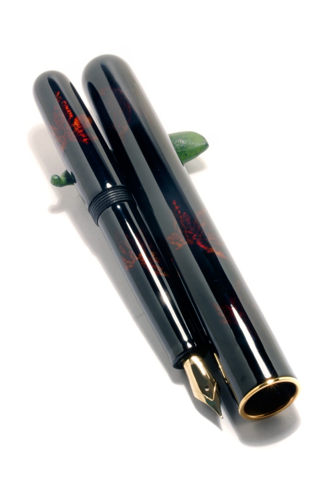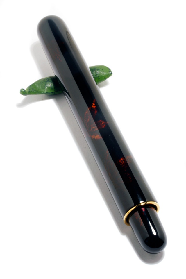 maple leafs painted with urushi lacquer were pressed on the pen body and sprinkled with different metal powders such as gold, copper and iron.