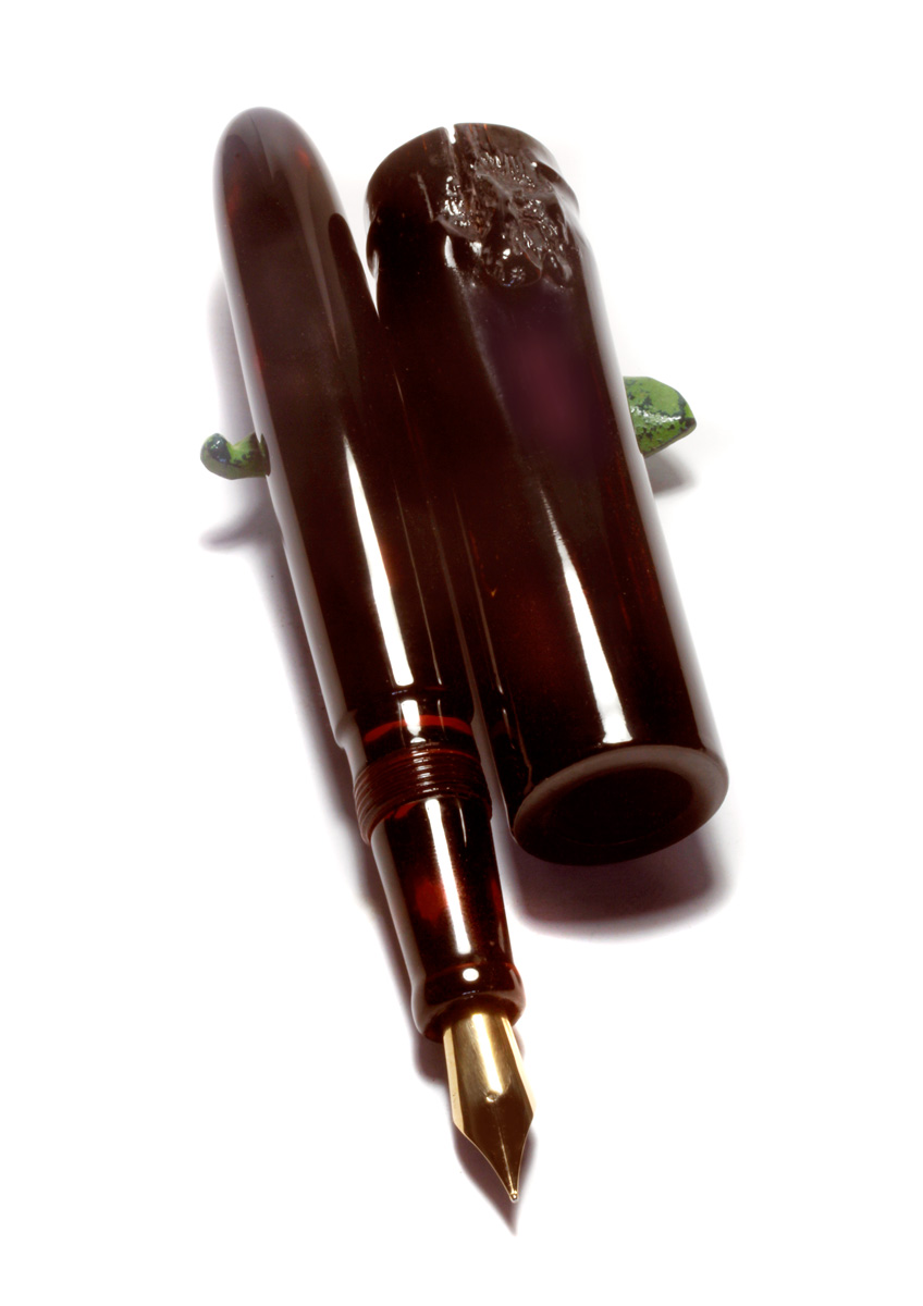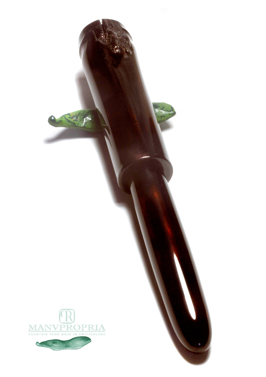 Thee cap as well the Ebonite barrel and section lacquered in "Aka Tame Nuri". Red "shû" underlayers covered by transparent black "kuro" urushi just to let the red layers shine through. "Aka" refers to the red lacquer, Tame refers to the final lacquer that let the underlayer show through