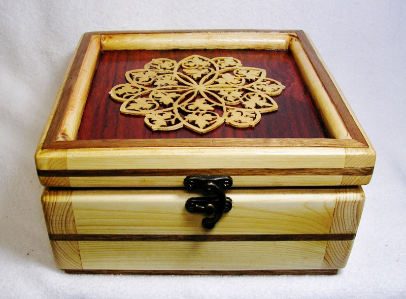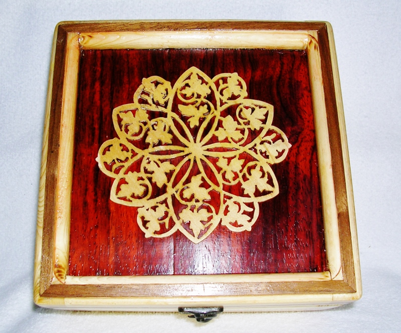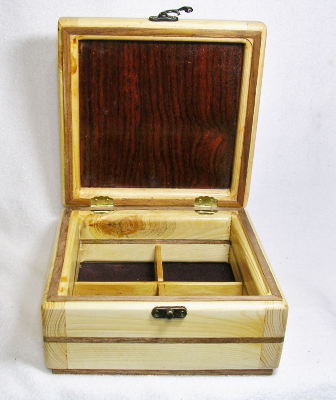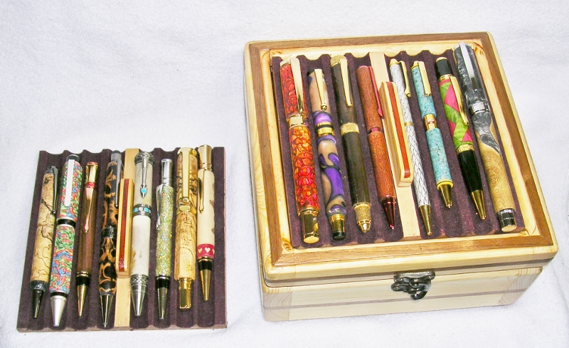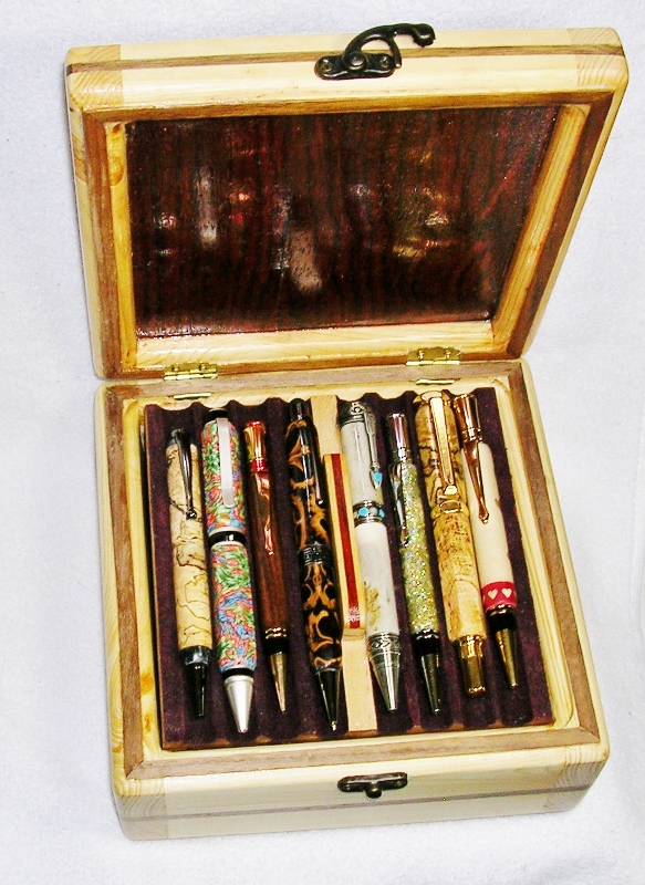 I built this little case for my wife for Christmas because she has pens scattered all over the house. The frame itself is knotty Pine, the top insert panel is Blood wood. Walnut segmented banding around sides, with walnut lid banding and spacers for trays. Inlace design on top of box is Baltic Birch, as are the dividers and bottom. Trays are routed hard board that I flocked in burgandy fiber. Old fashioned hardware for latch. Hand rubbed Hydro-coat finish. Can be used as jewelry, keepsake, storage, or display box, and will hold 32 pens. Photos show some of the configurations that are possible. Jim S