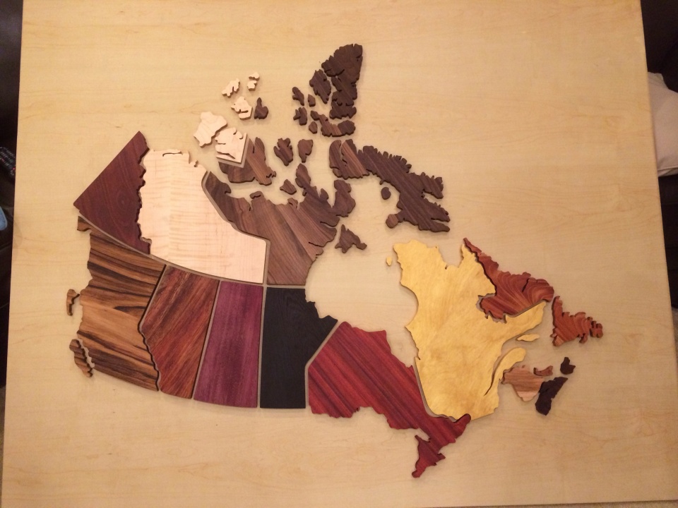 Hey, a couple months ago I had a great idea to make a map of Canada out of 14 different exotic hardwoods! Turns out after cutting out a piece is was not such a great idea.... So many small cuts and so much sanding