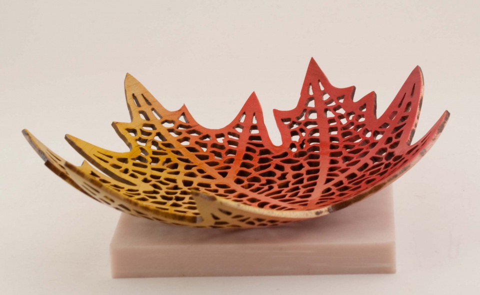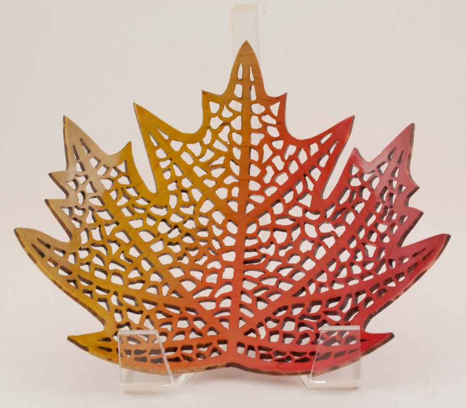 Maple Leaf, turned from Maple, pierced and airbrushed. Around 6" (15cm) across. Finished with waterborne lacquer. Created as part of a public demo at The Woodworking Shows to promote the artistic side of woodturning and the local woodturning clubs of Connecticut and Massachusetts.