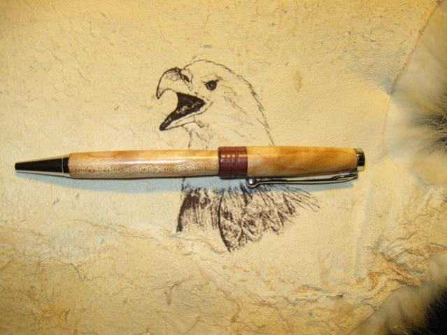 This is my first attempt at a 2 tone I guess or custom center band, not sure. I used Purpleheart for the center band and some Figured Maple for the rest, all those cutoff ends are going to come in handy now. Sort of wish I had some wire burners for the center band but they are my next purchase. I have more ideas now of what to do with slimline kits since I found this was easy to do. As always all comments are welcome and you all have a great day.